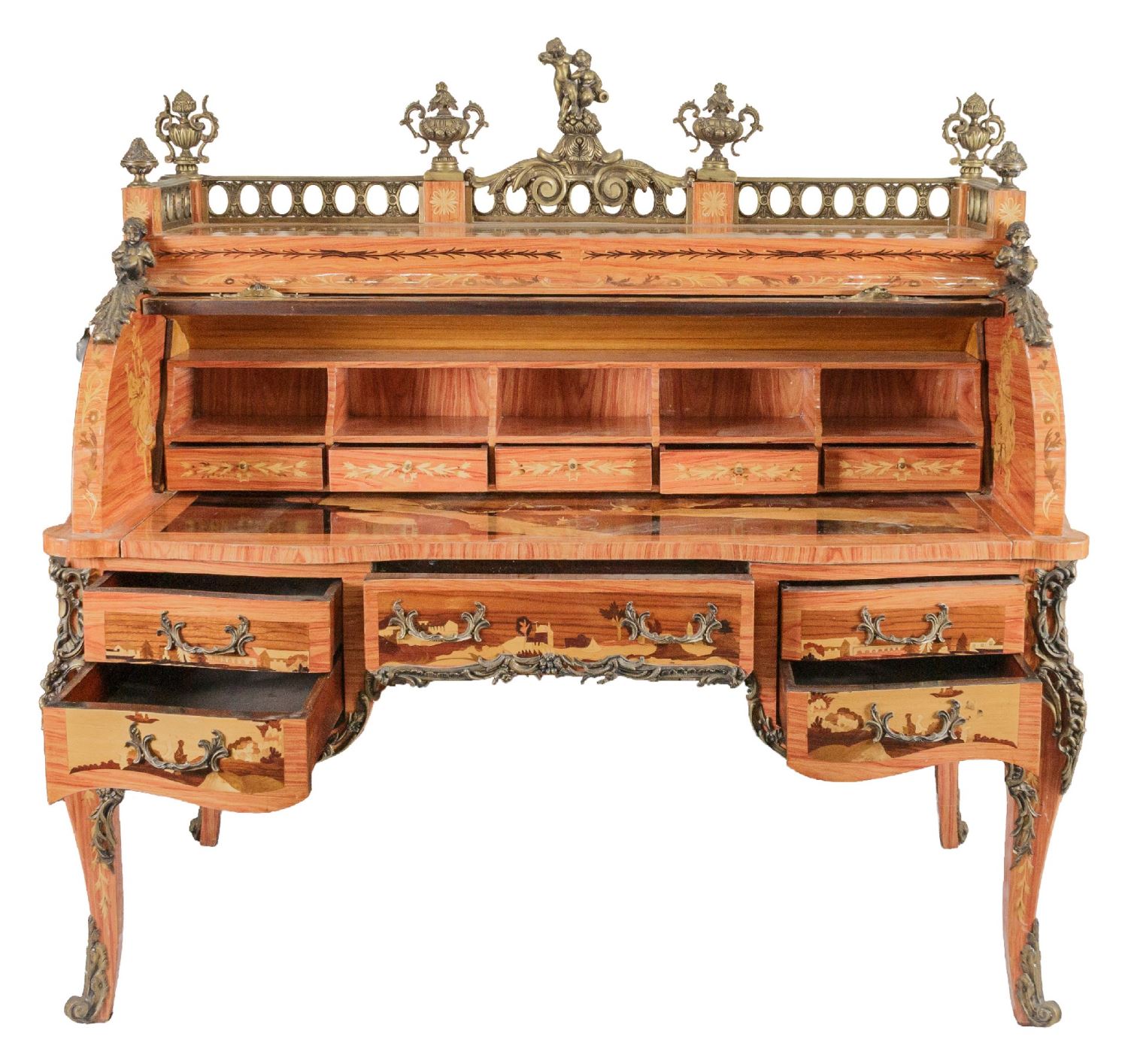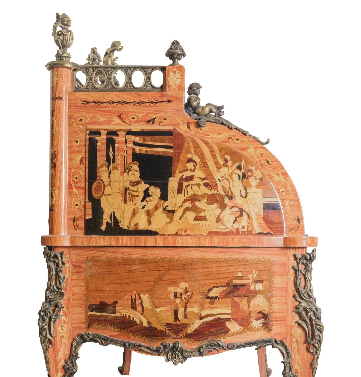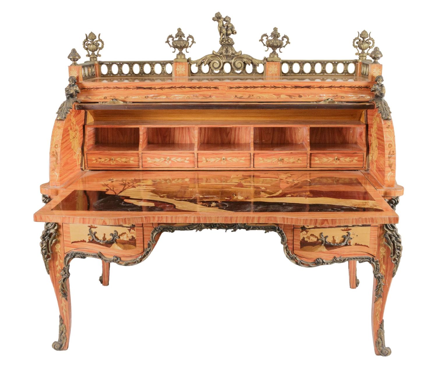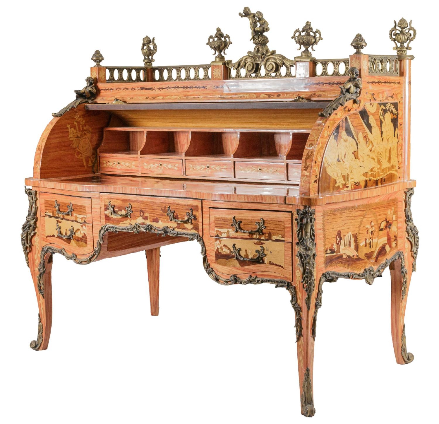 Realizdo en madera con marquetería de frutales y aplicaciones en bronce. Presenta tapa de cilindro con diferentes registros de gavetas y cajones en el interior y tablero extraíble. En la parte interior dos registros de cajones a cada lado con cajón en el centro. Patas acabrioladas. Decorado con escena en referencia al juicio de Salomón en la tapa, en los laterales y en la parte trasera, mientras que la decoración de la parte inferior tiene motivos de paisajes. Medidas: 160 x 160 x 85 cm.