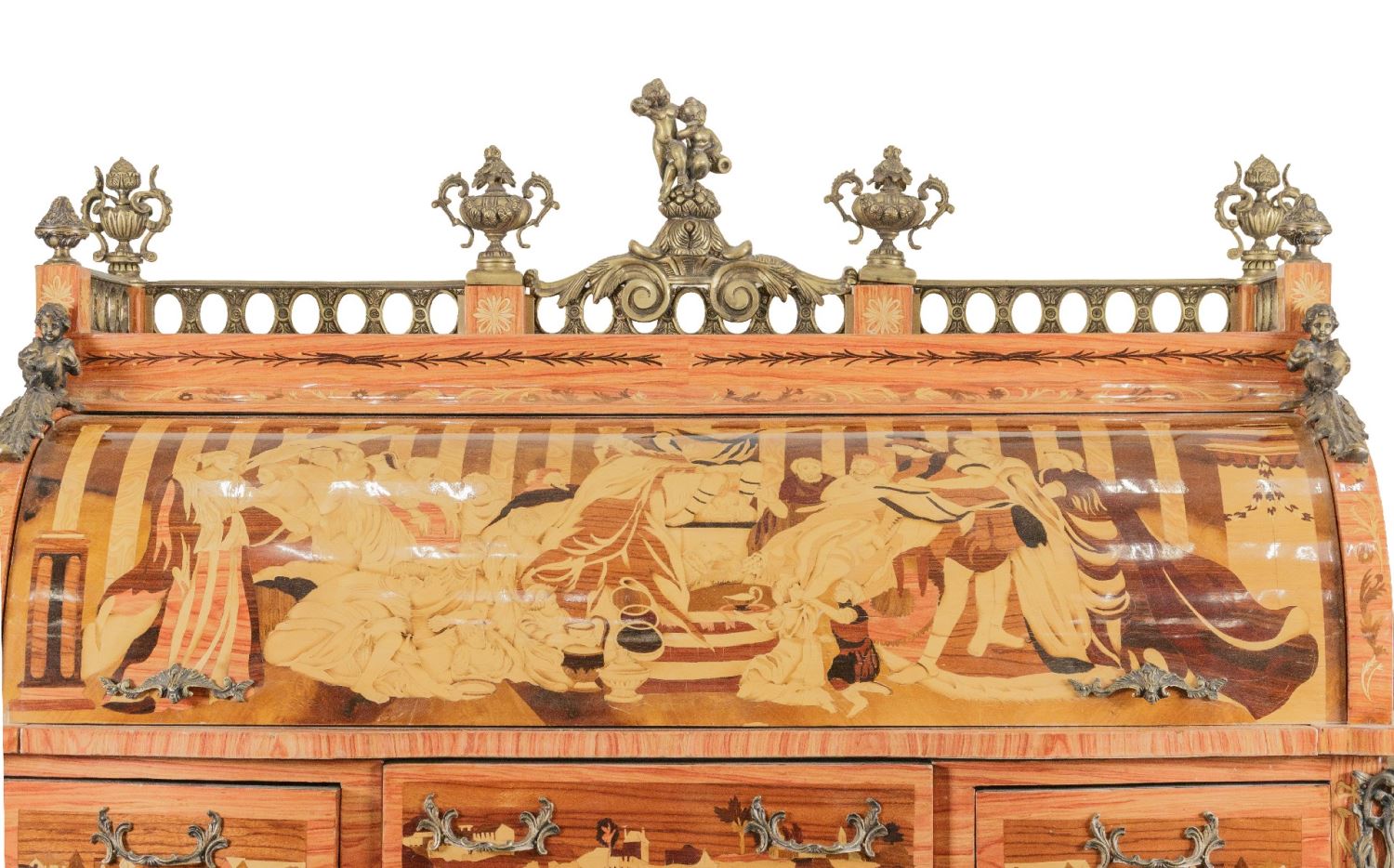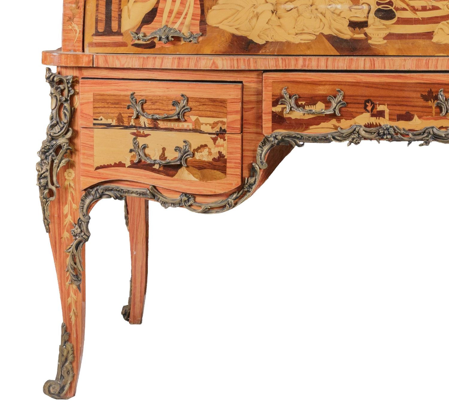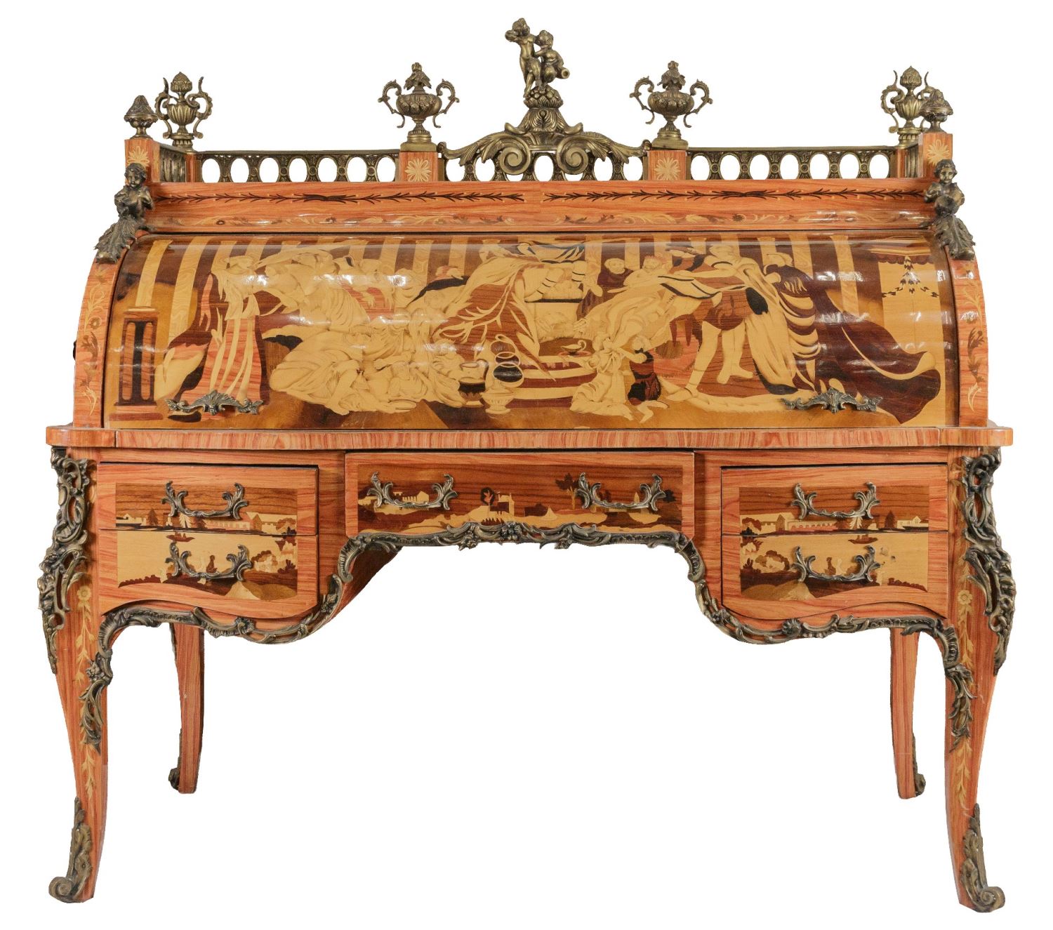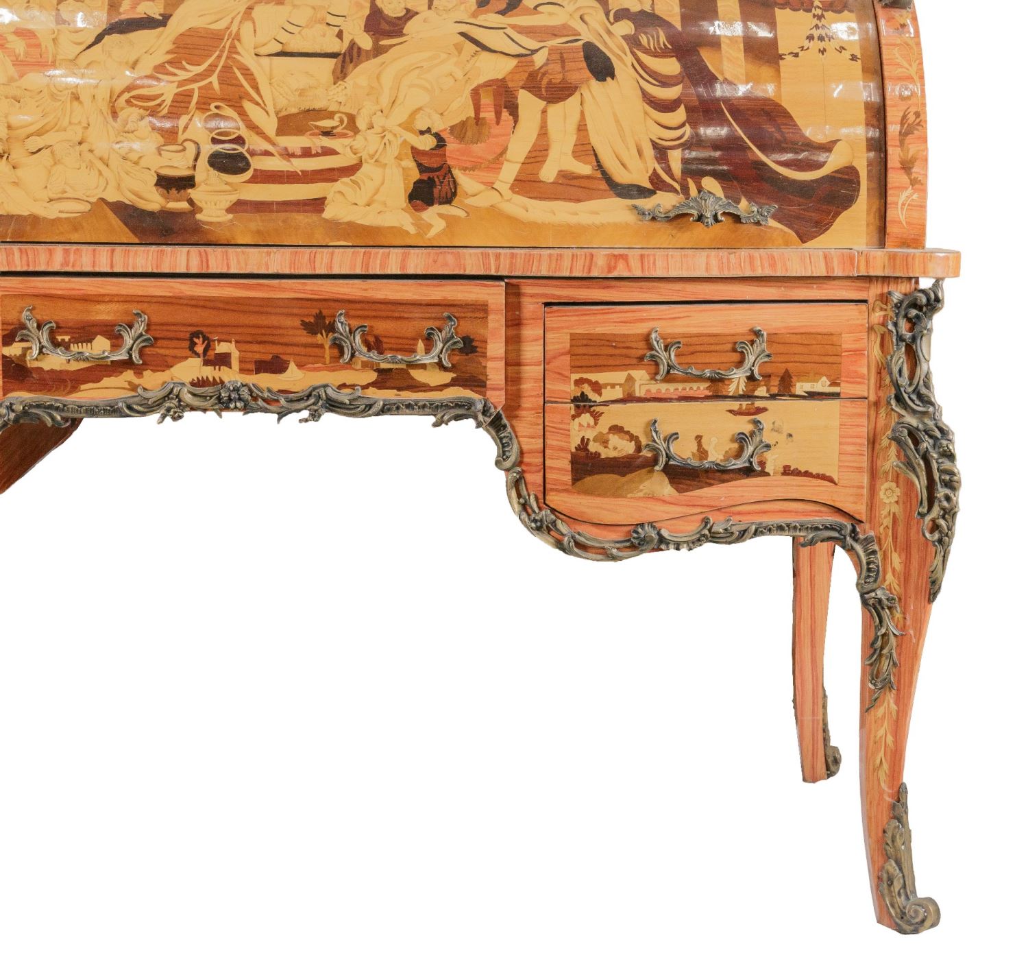 Realizdo en madera con marquetería de frutales y aplicaciones en bronce. Presenta tapa de cilindro con diferentes registros de gavetas y cajones en el interior y tablero extraíble. En la parte interior dos registros de cajones a cada lado con cajón en el centro. Patas acabrioladas. Decorado con escena en referencia al juicio de Salomón en la tapa, en los laterales y en la parte trasera, mientras que la decoración de la parte inferior tiene motivos de paisajes. Medidas: 160 x 160 x 85 cm.