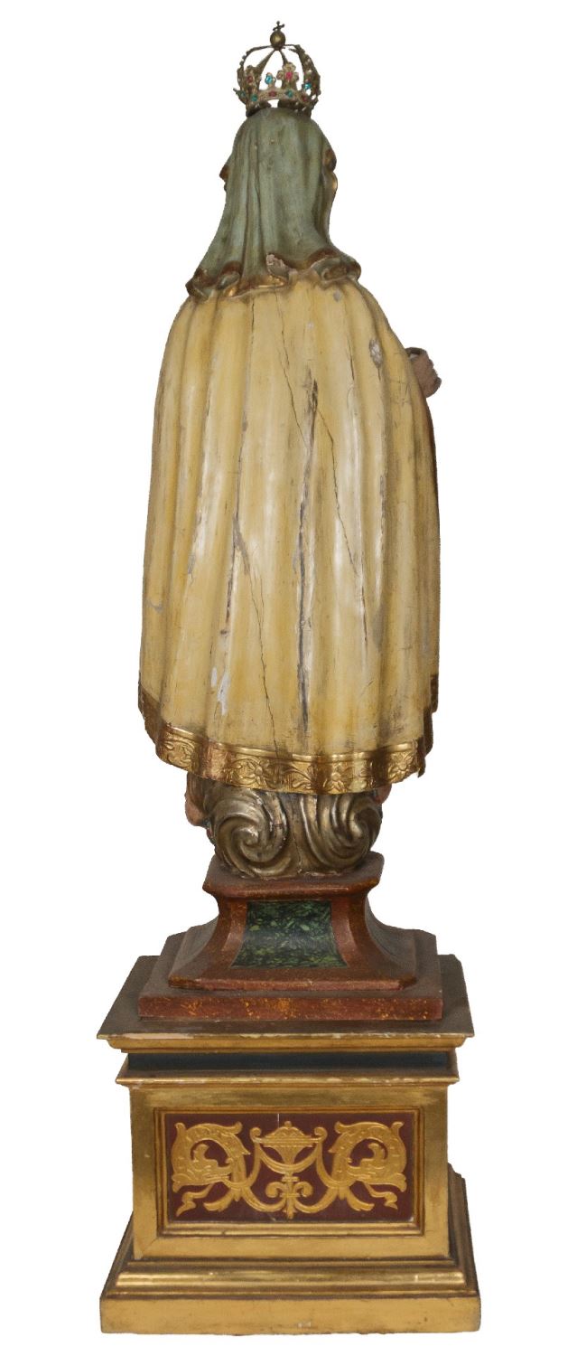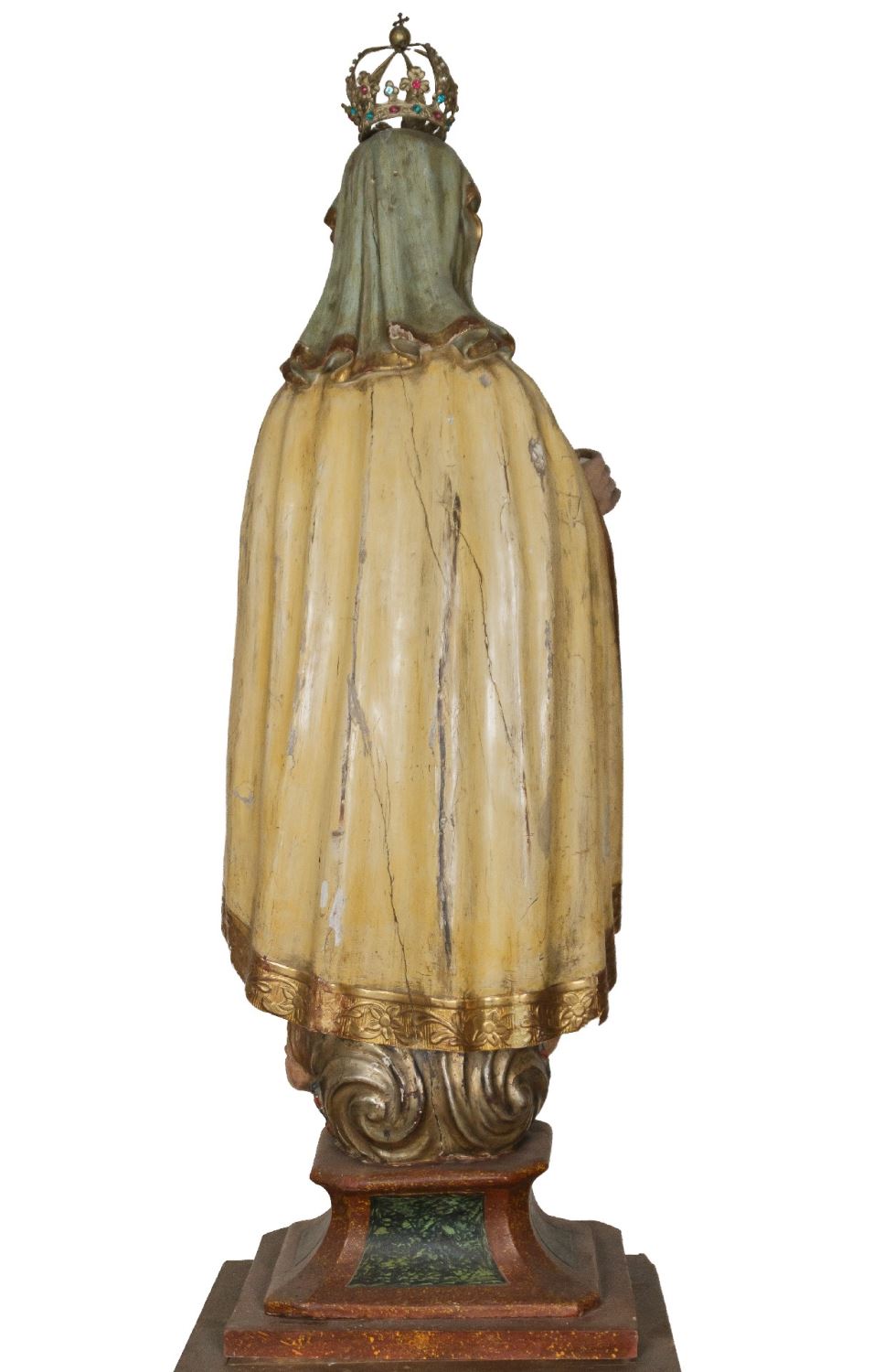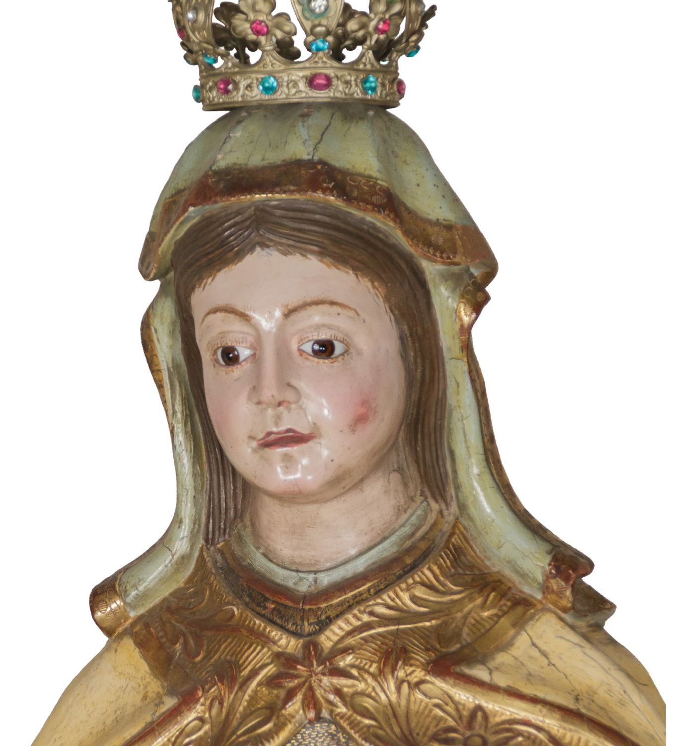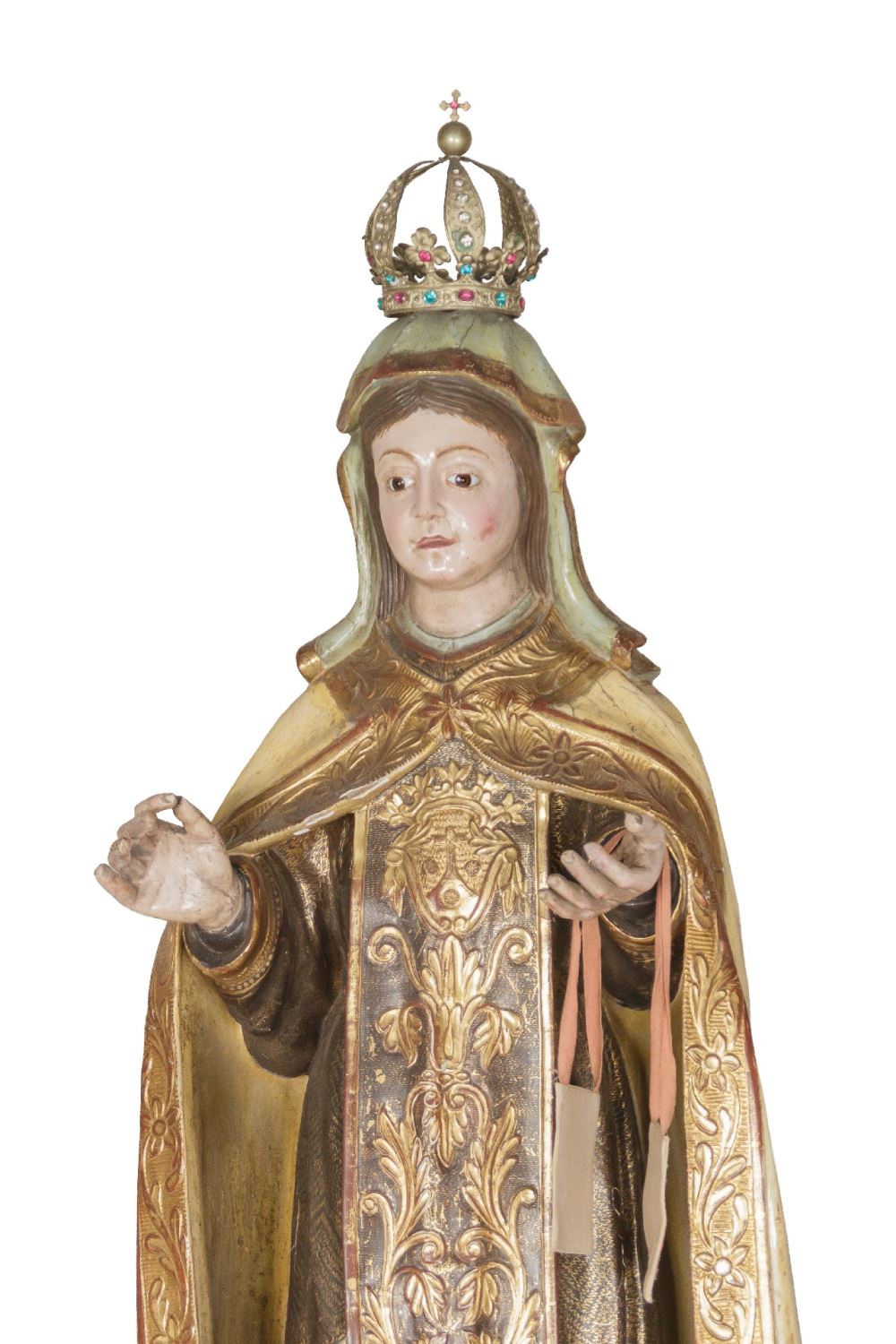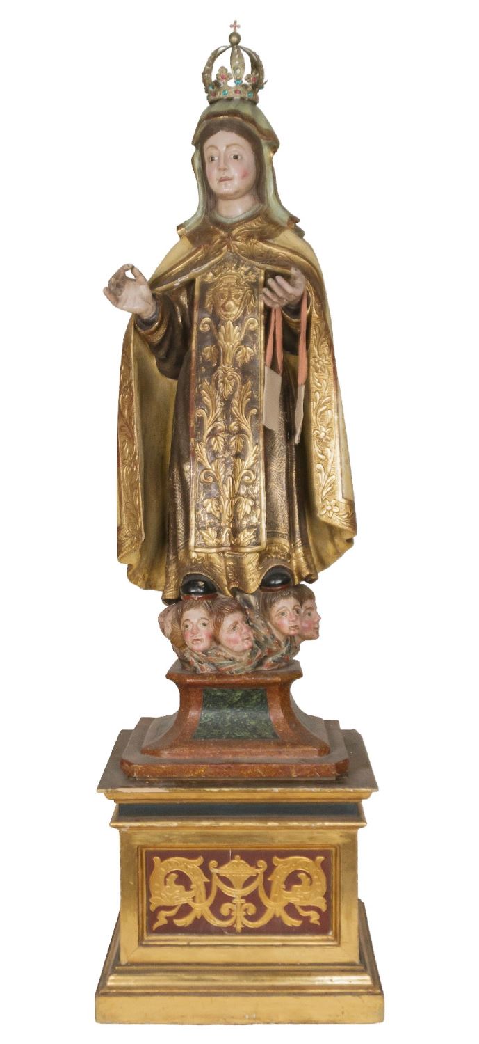Virgen del Carmen. Realizada en madera tallada, dorada y policromada. Se acompaña de peana. Medidas: 186 x 50 x 50 cm.