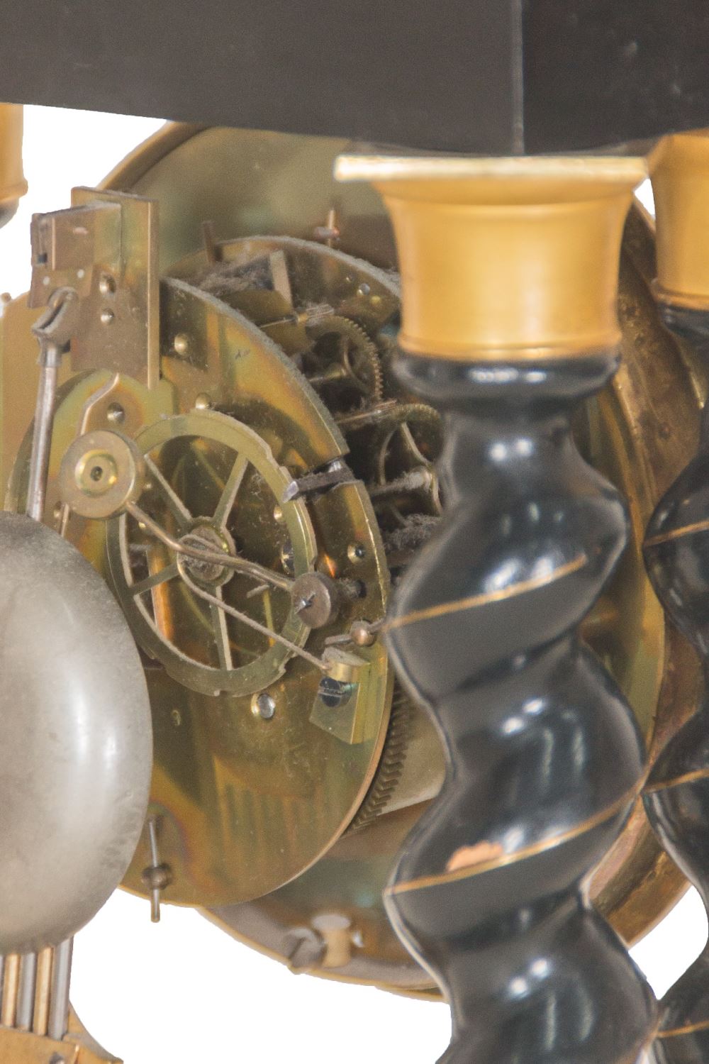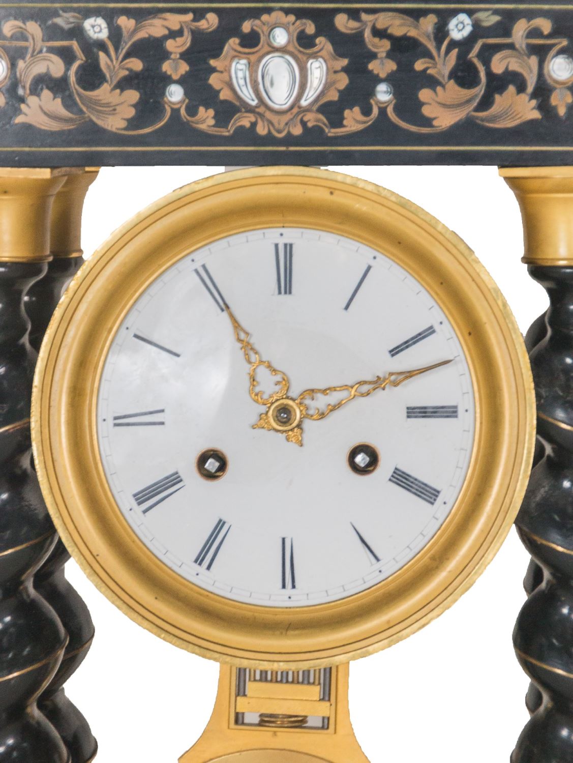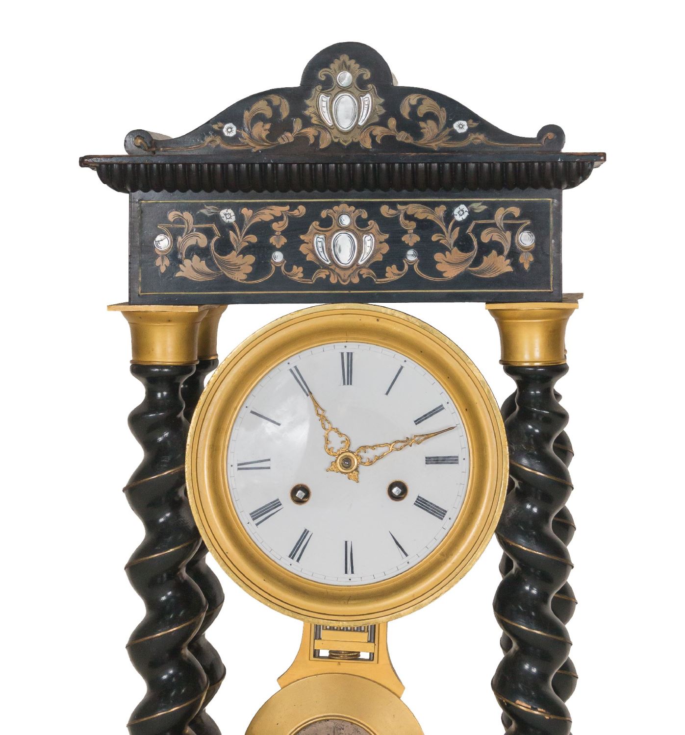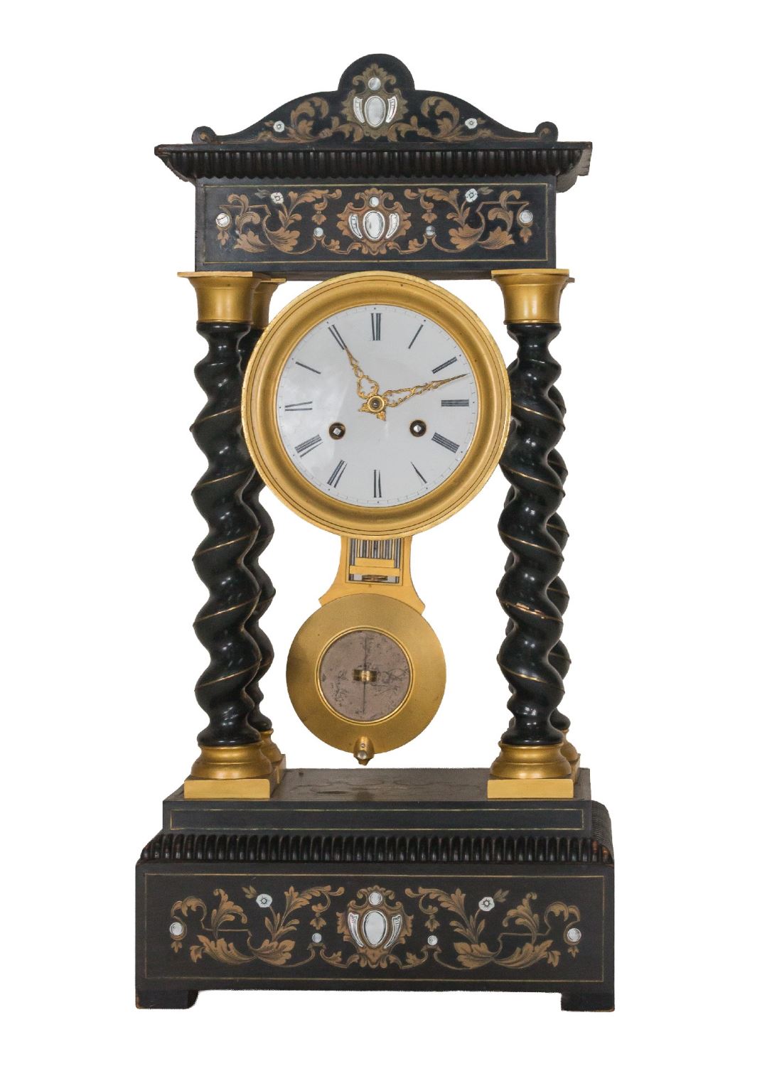 Realizado en madera ebonizada, bronce y con incrustaciones en latón y nácar. Presenta columnas torneadas yesfera en esmaltada con numeración romana. Medidas: 48 x 25 x 14 cm.