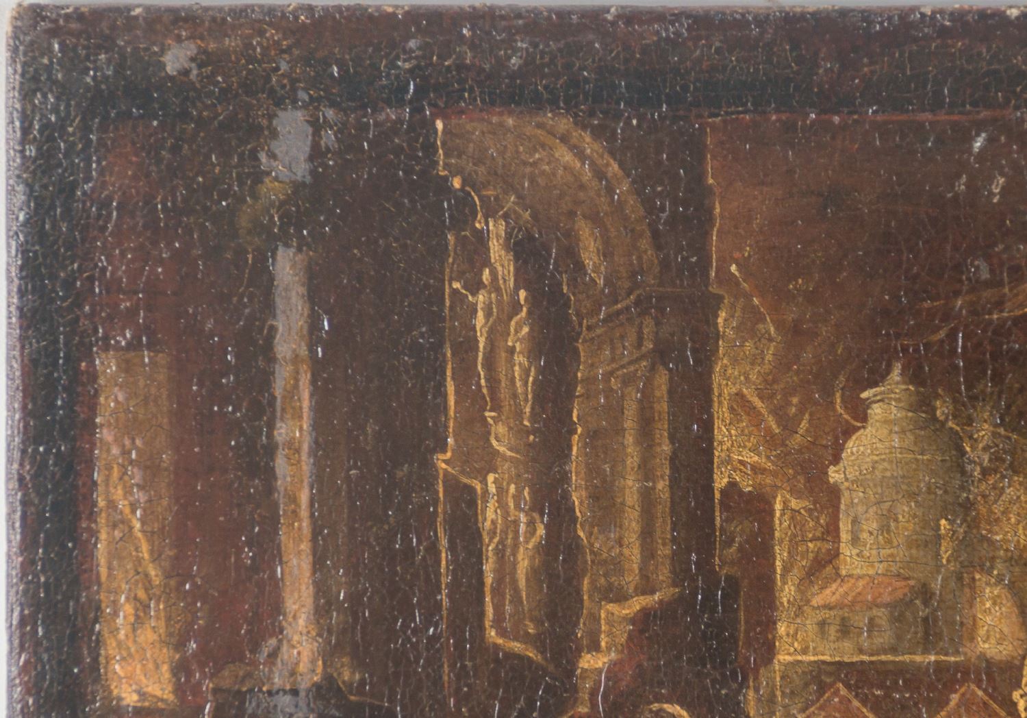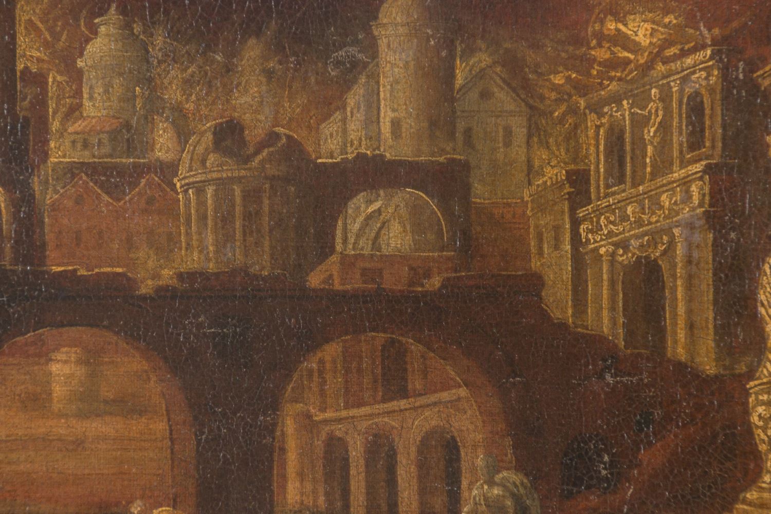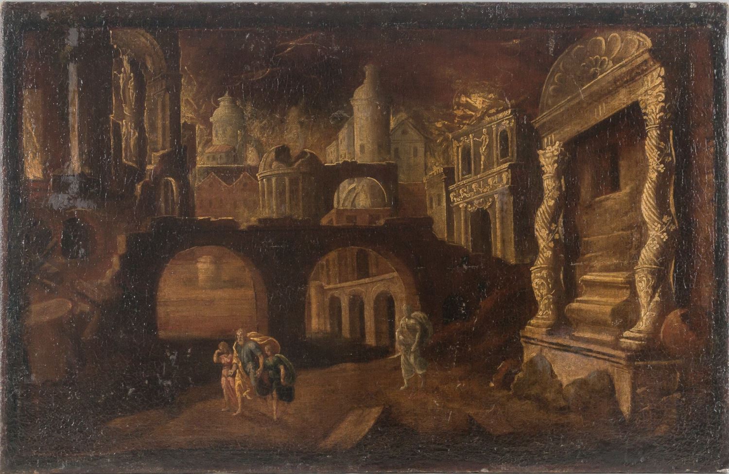 Huida de Lot y sus hijas ante la caída de Sodoma y Gomorra. Óleo sobre lienzo. Ligeros repintes. Reentelado. Medidas: 50 x 78 cm.