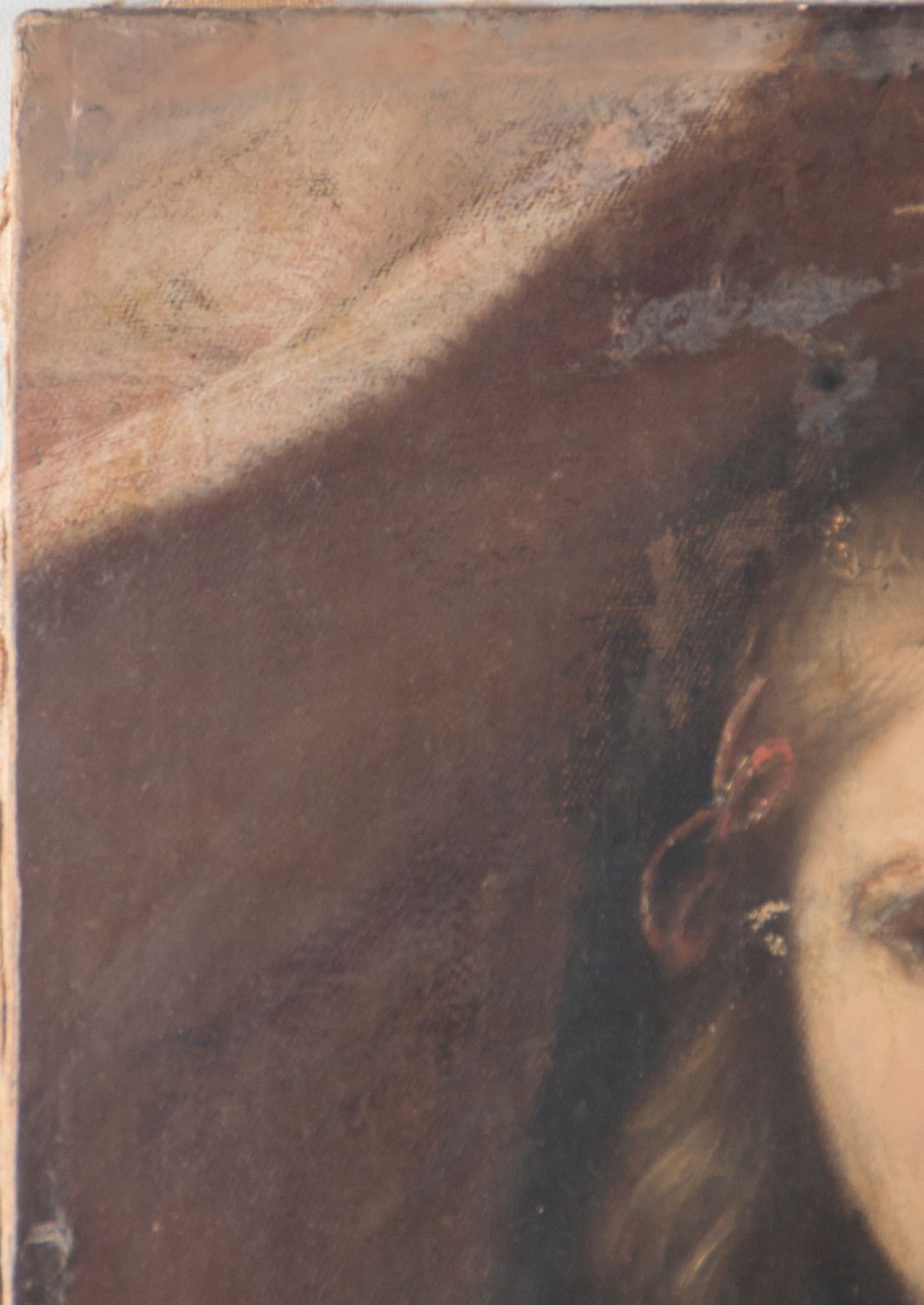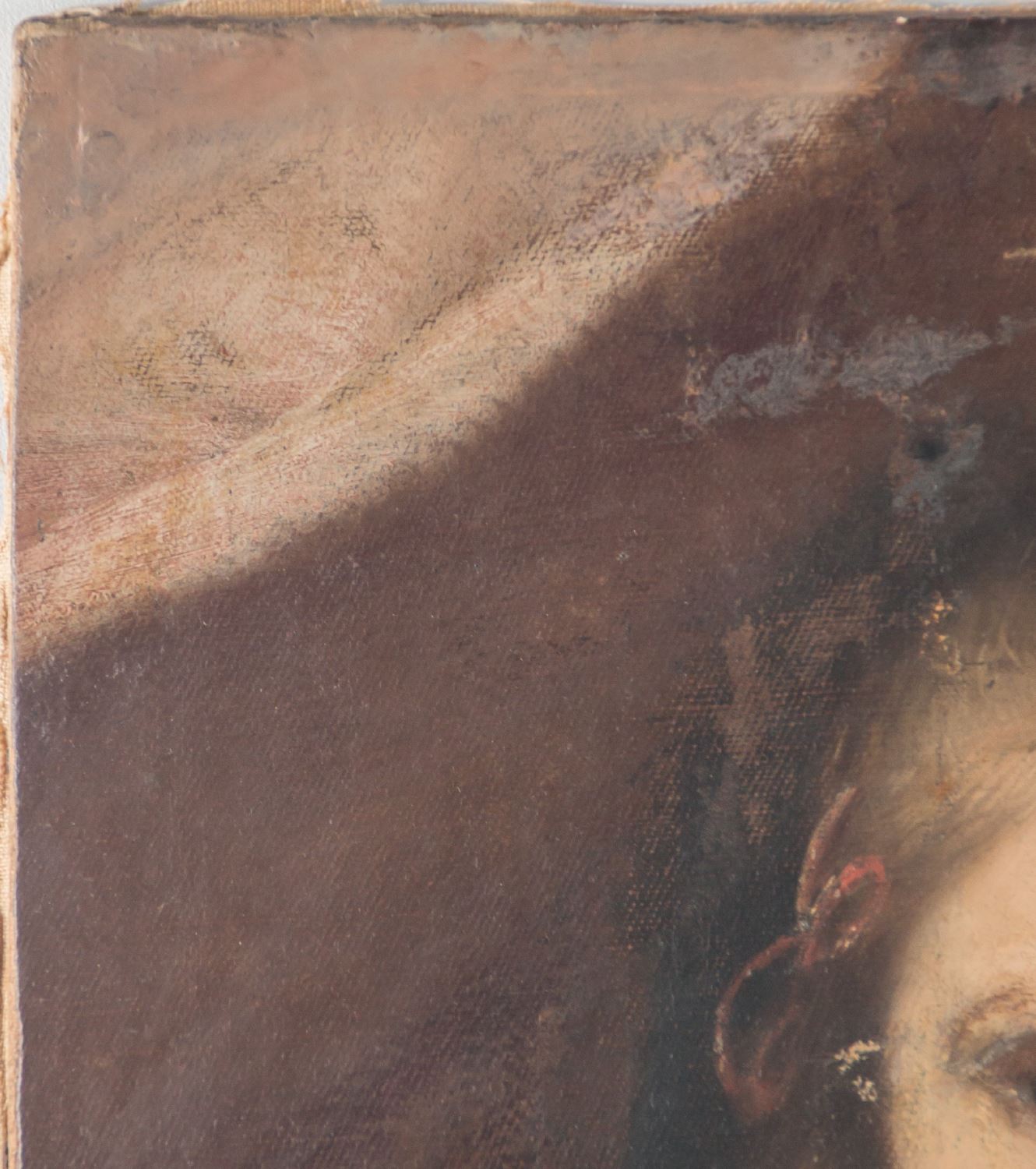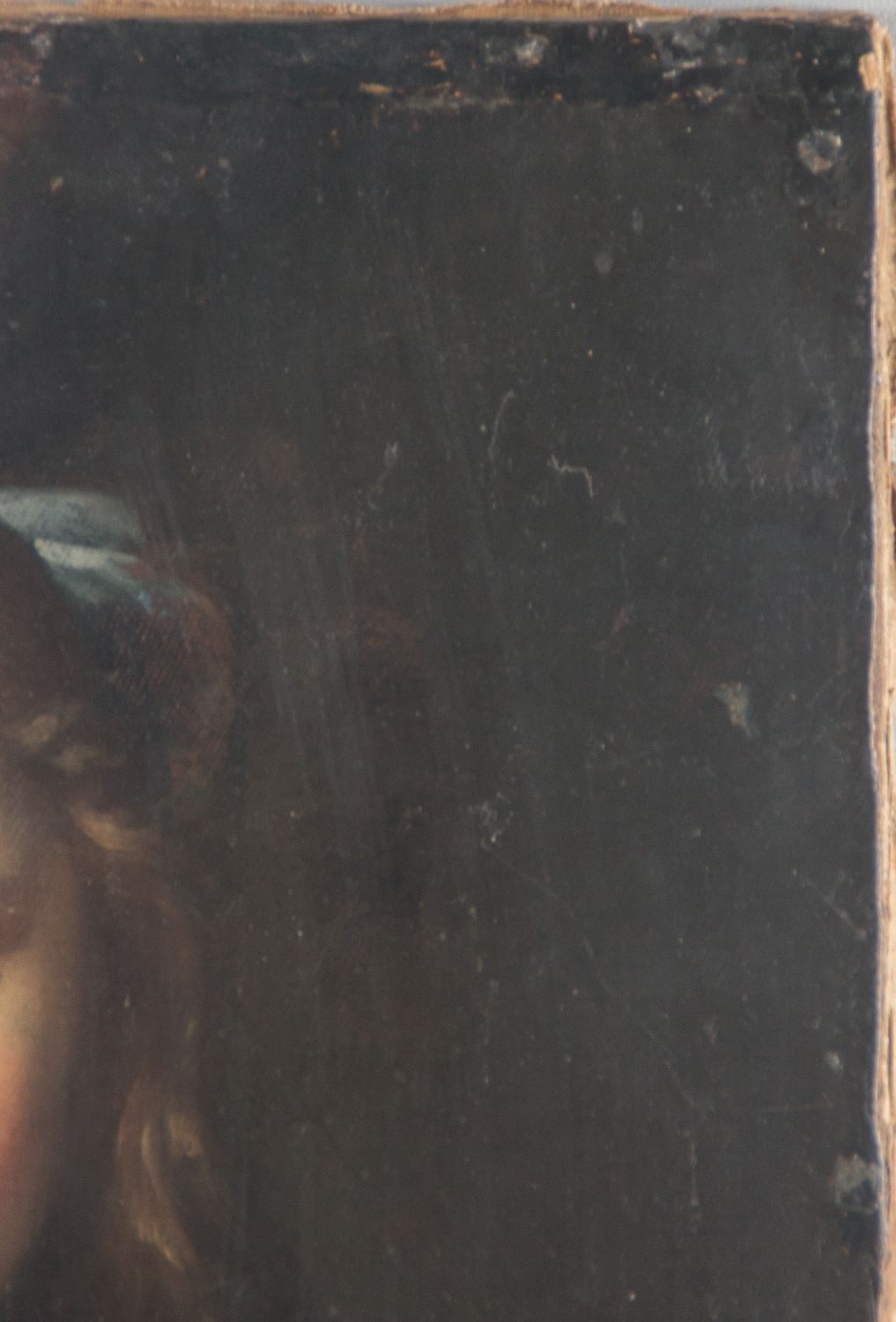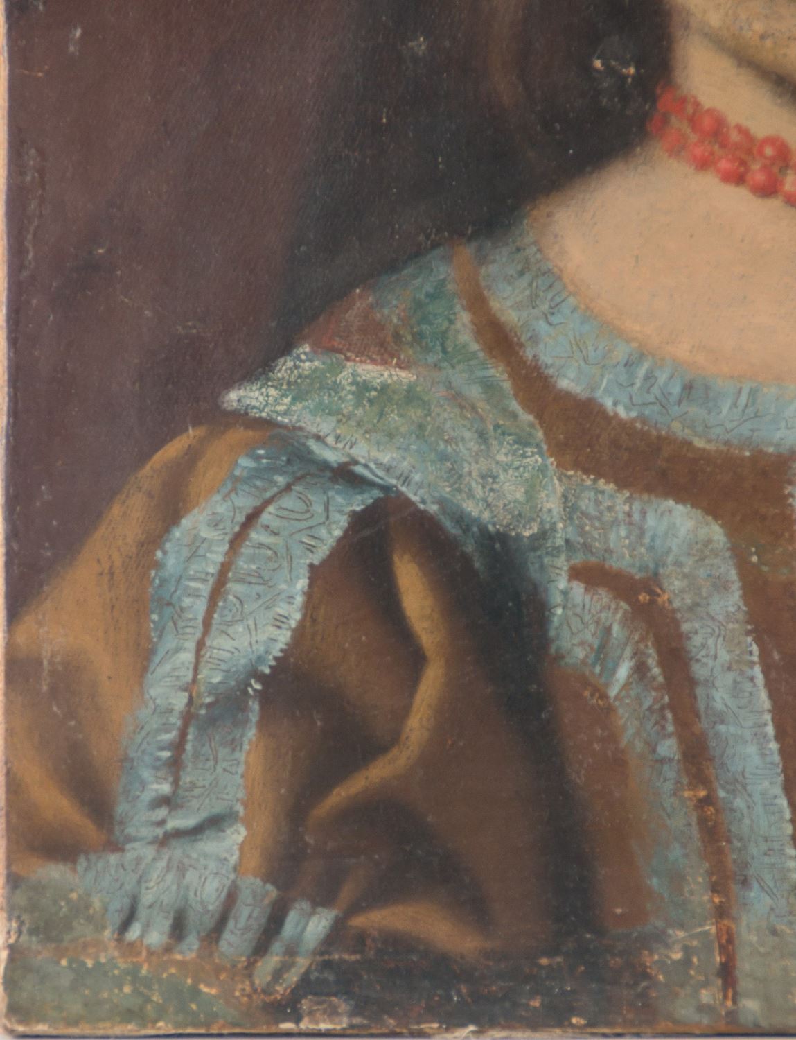 Retrato de joven, posiblemente una dama de corte. Óleo sobre mantelillo ?. Reentelado. Repintes y alguna falta. Medidas: 48 x 41 cm.