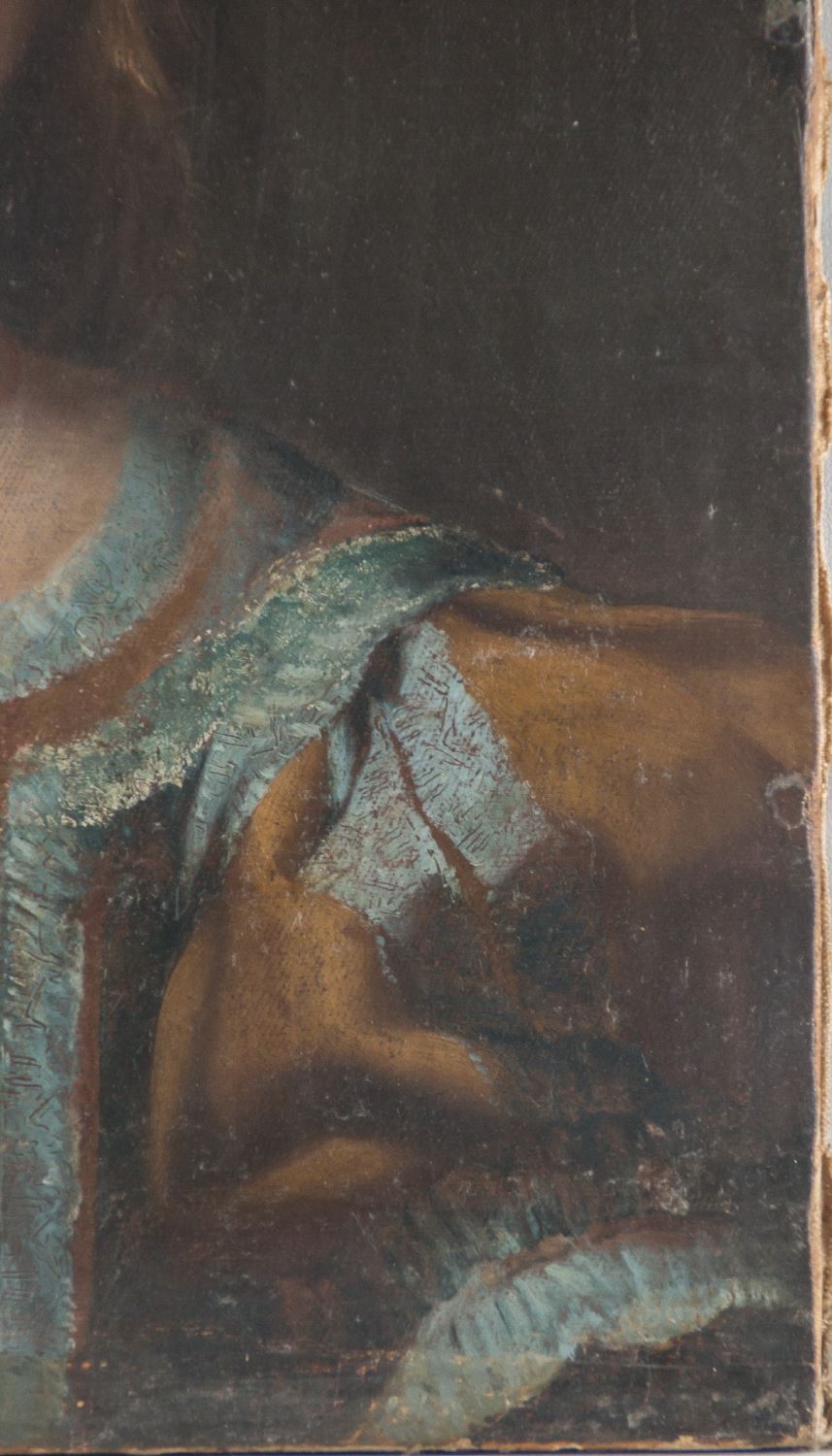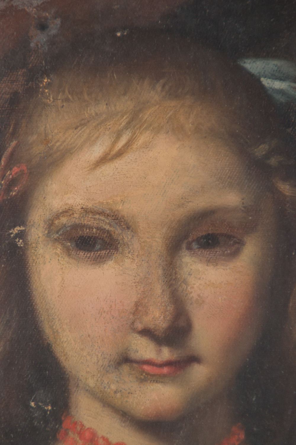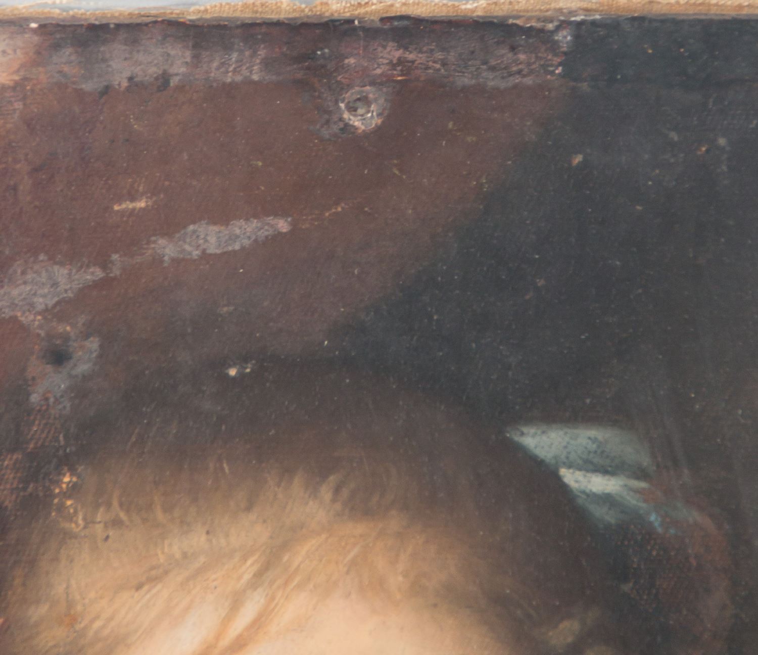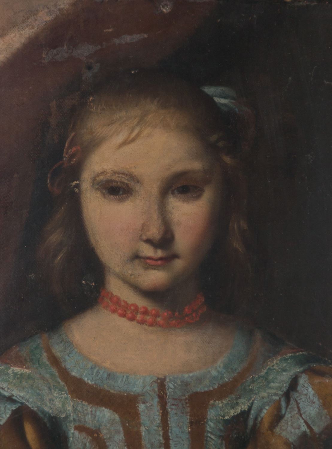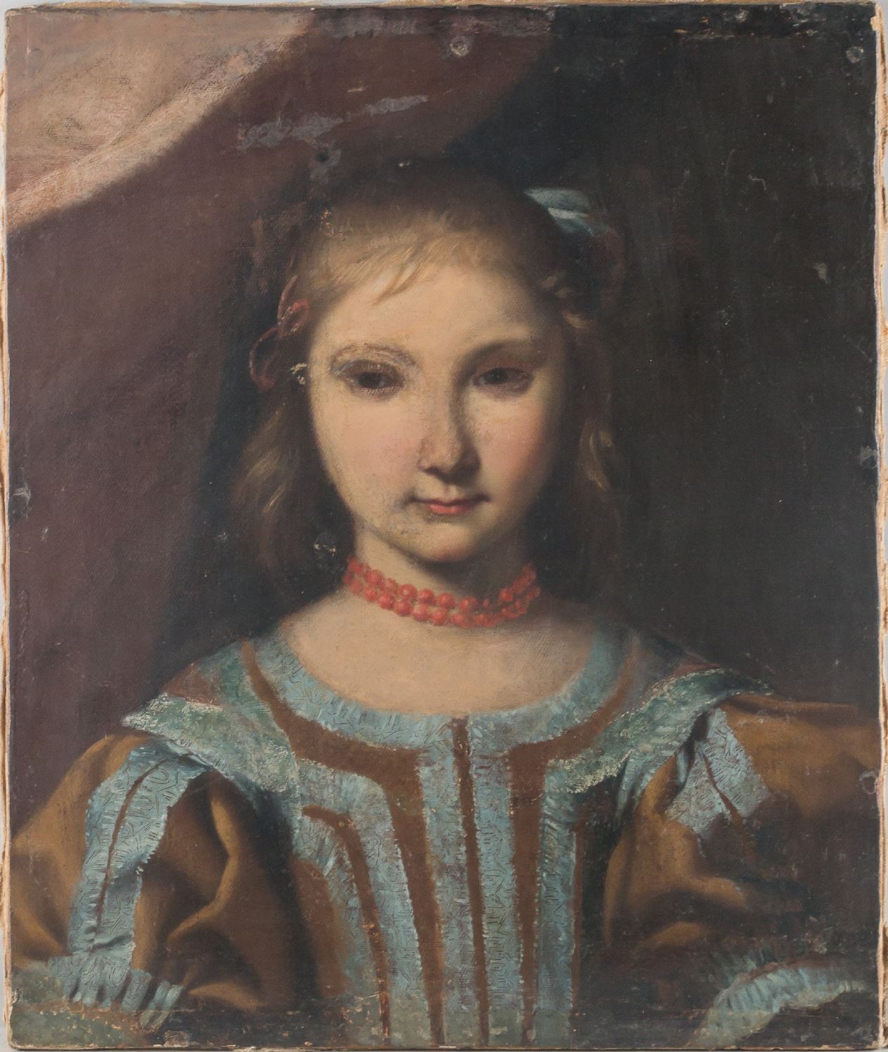 Retrato de joven, posiblemente una dama de corte. Óleo sobre mantelillo ?. Reentelado. Repintes y alguna falta. Medidas: 48 x 41 cm.