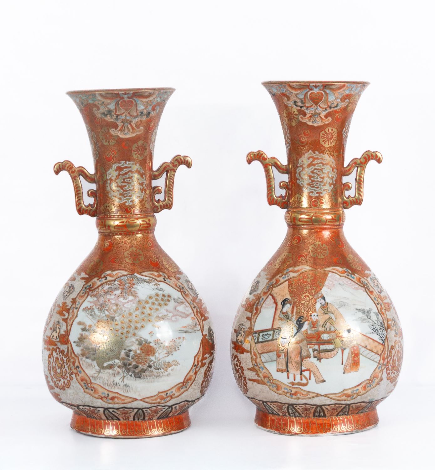 Realizados en porcelana esmaltada y dorada. Presentan decoración de escenas palaciegas en reservas en el anverso y decoración de pavos reales en las escenas del reverso. Profusa decoración por toda la superficie. Marcas en la base. Medidas: 46 x 24 cm.