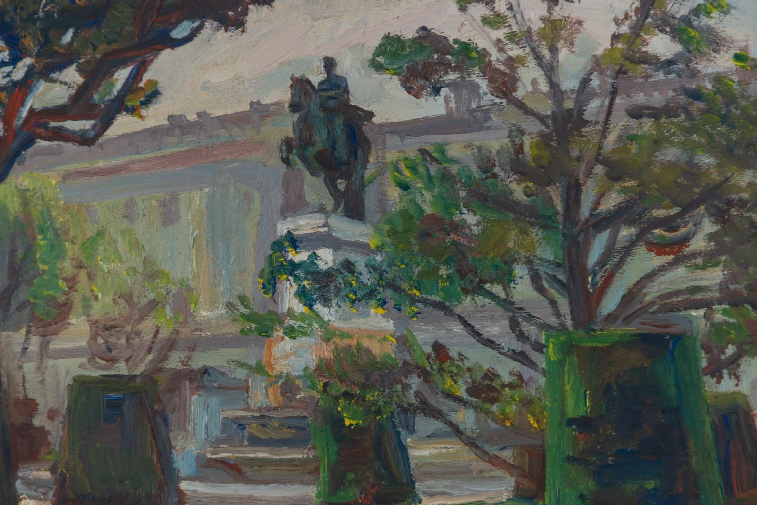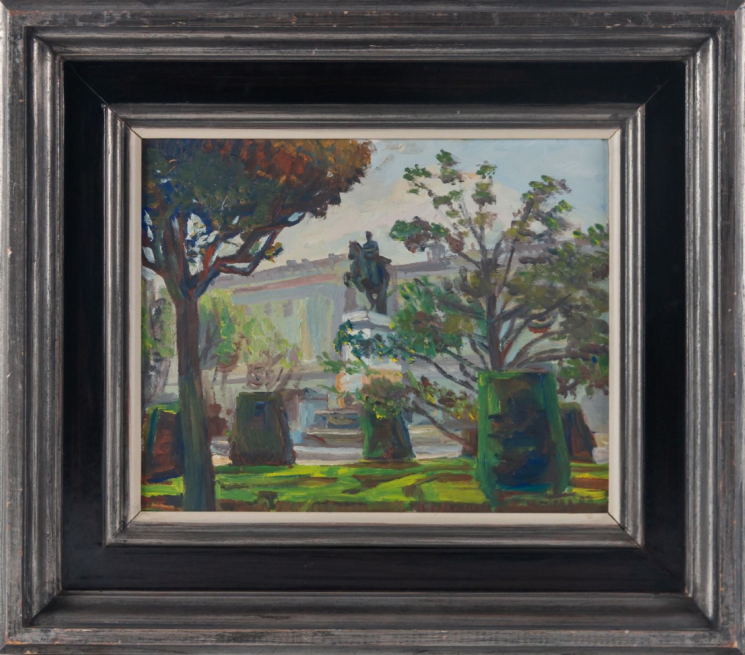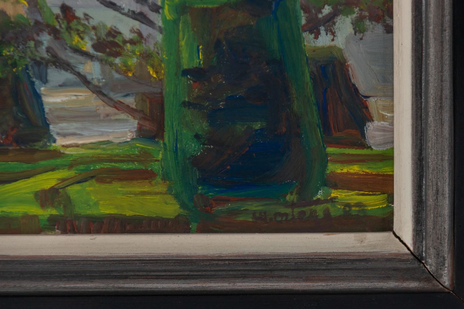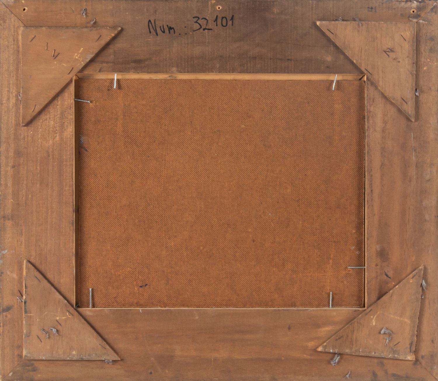 Vista con paisaje ecuestre. Óleo sobre tablex. Firmado y fechado en 1983. Medidas con marco: 55,5 x 63,5 cm.