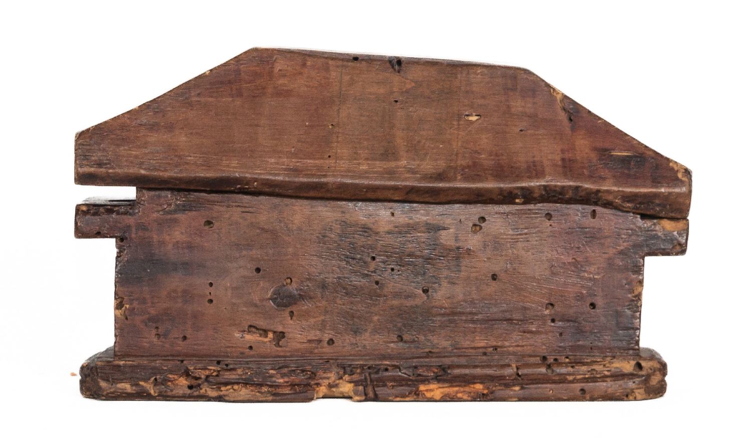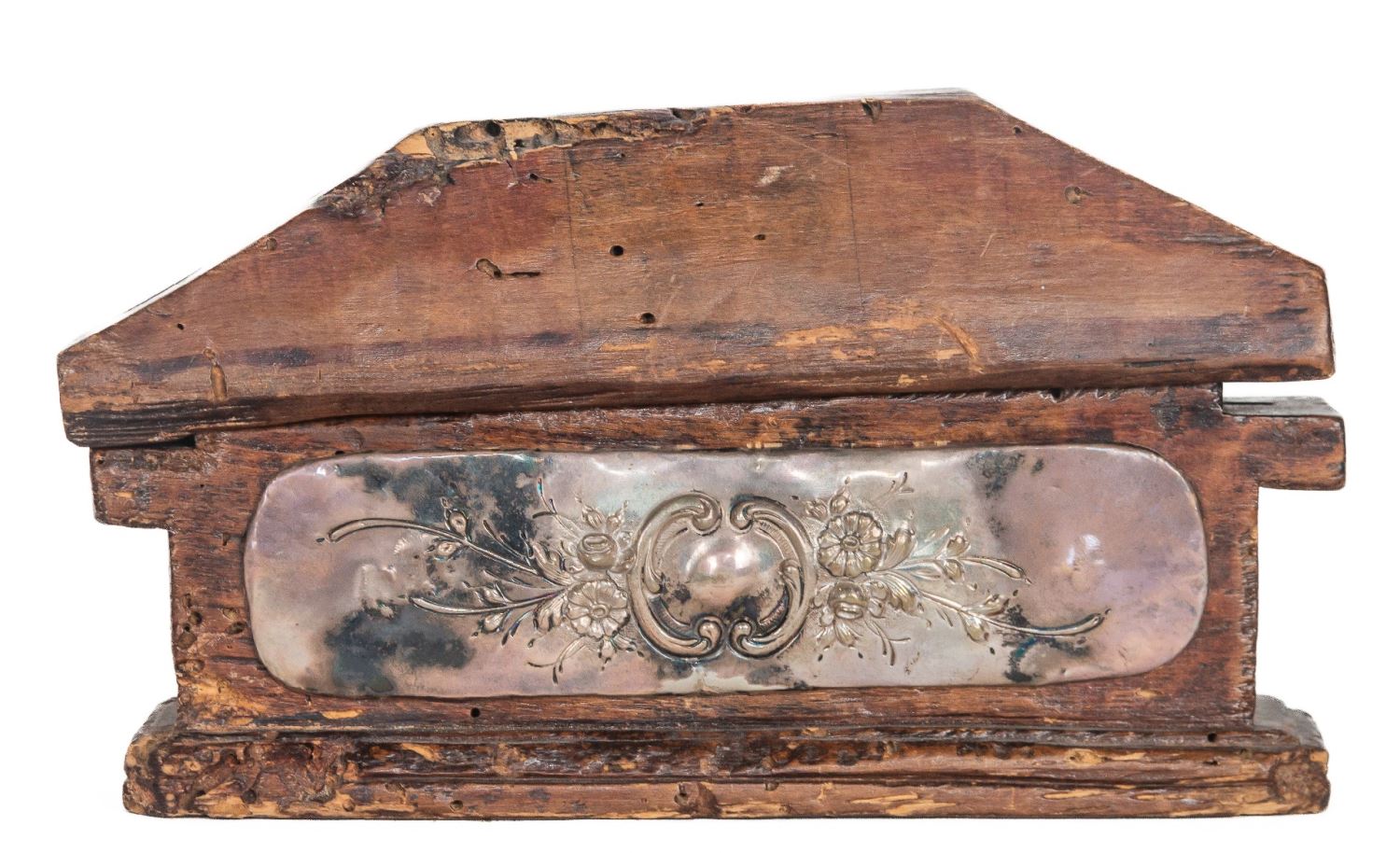 Realizada en madera tallada con frente en estaño repujado. Decoración repujada con tornapuntas y motivos florales. Medidas: 14 x 24 x 6 cm.
