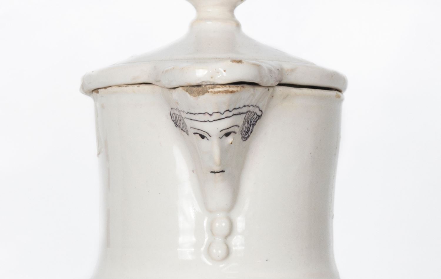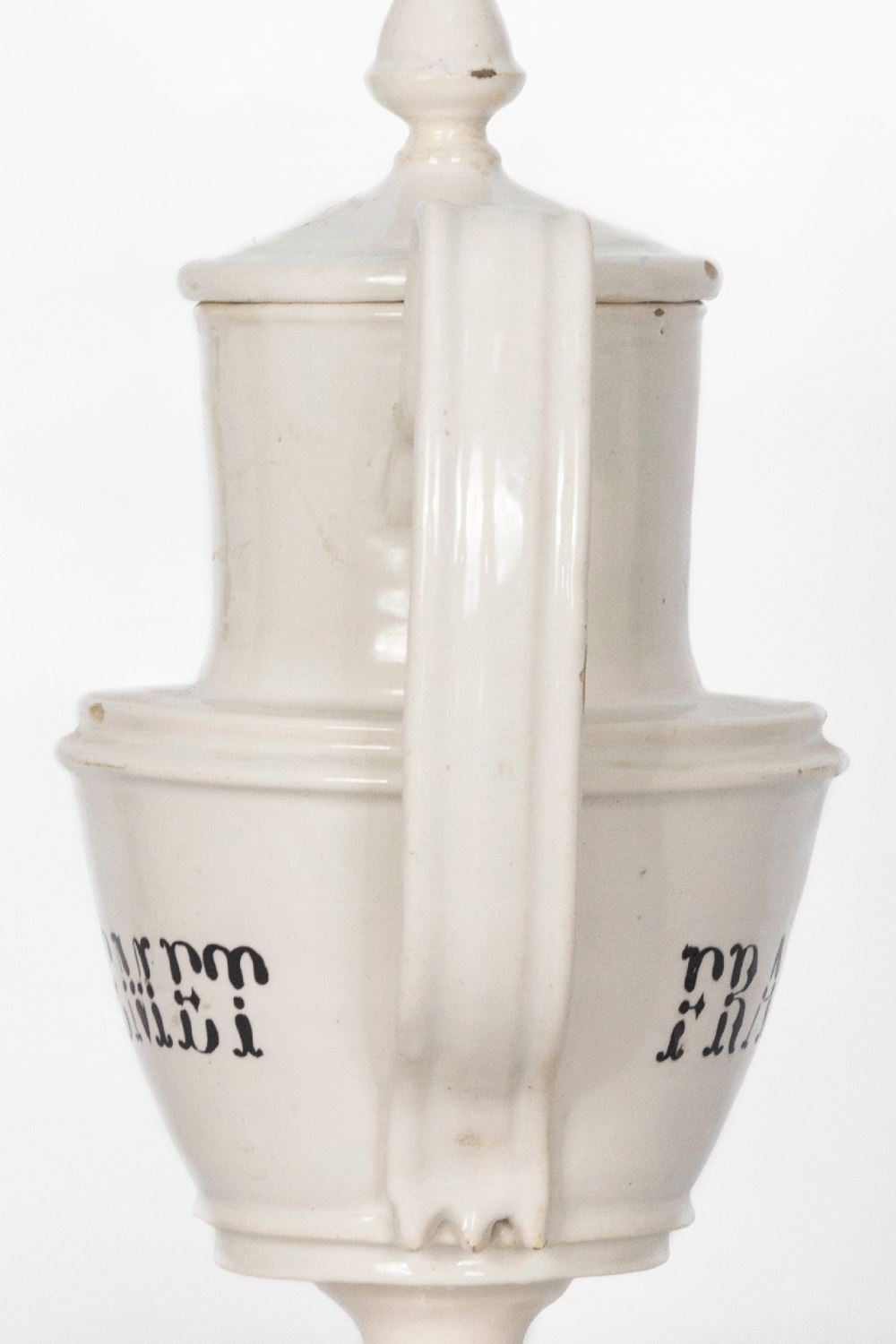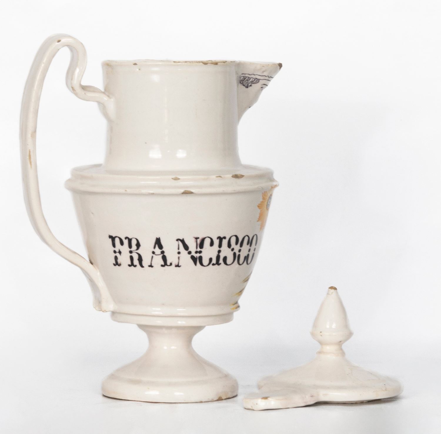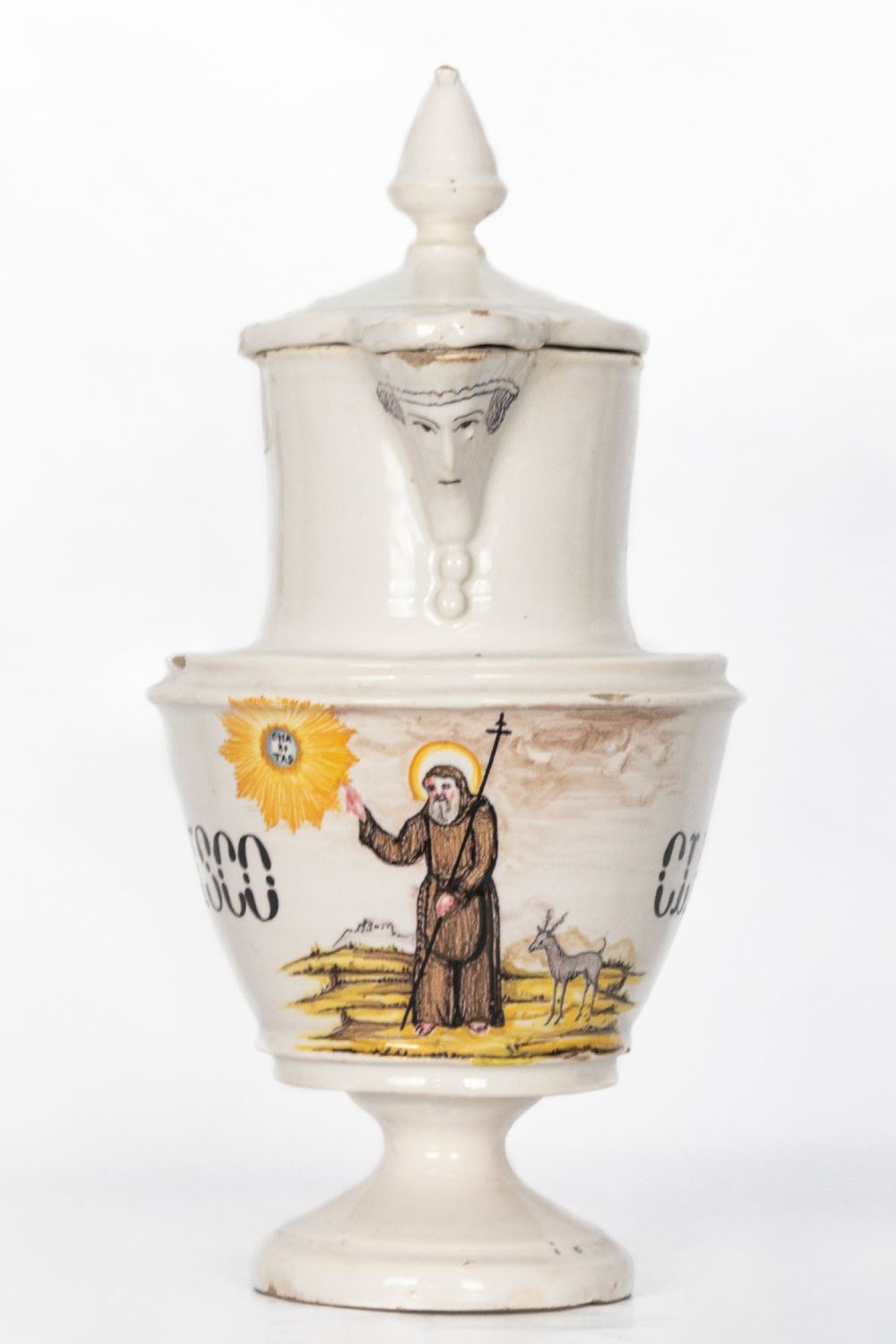 Realizado en cerámica esmaltada. Presenta mascarón en el pico y tapa. Decorado con inscripción y escena con San Francisco. Altura: 40 cm.