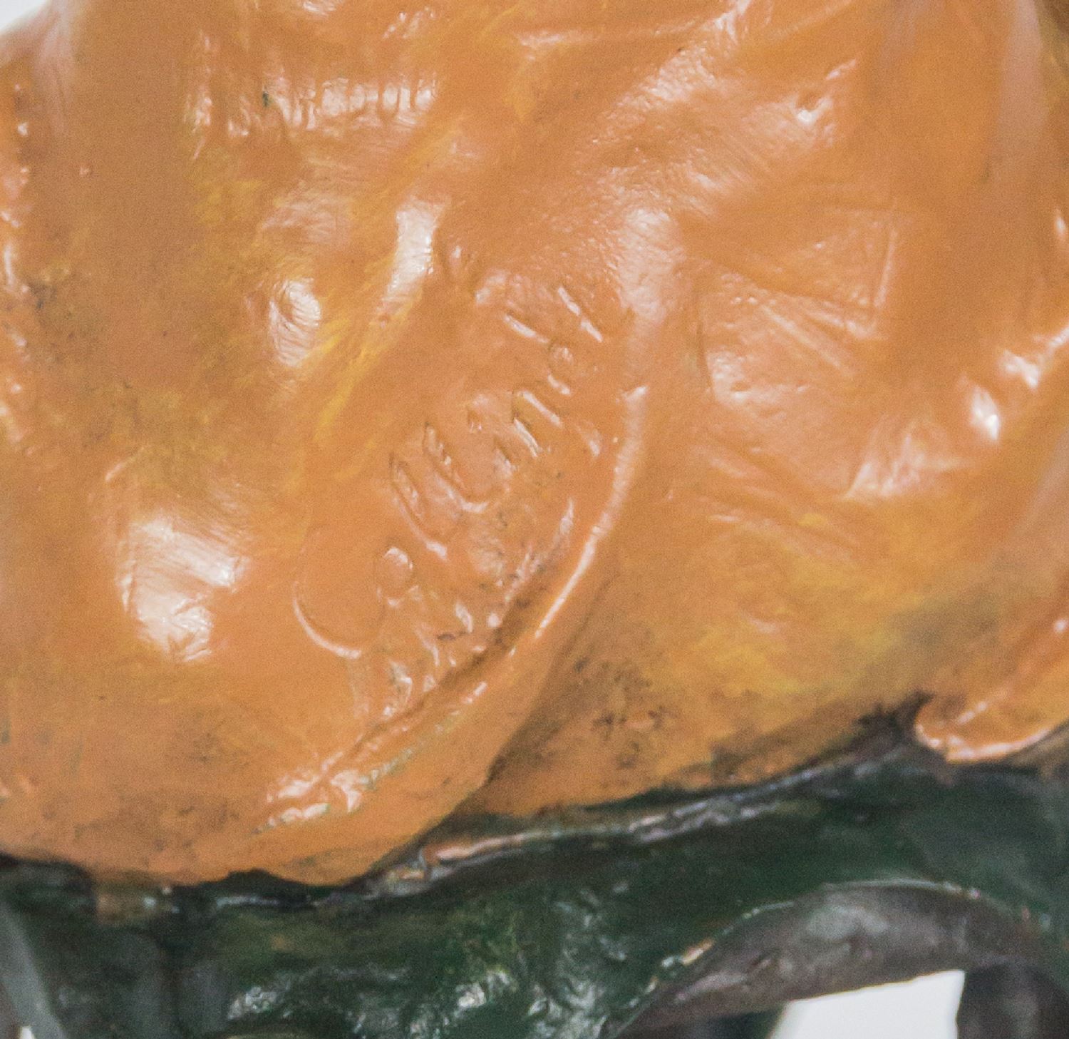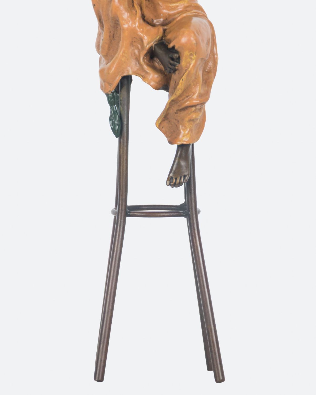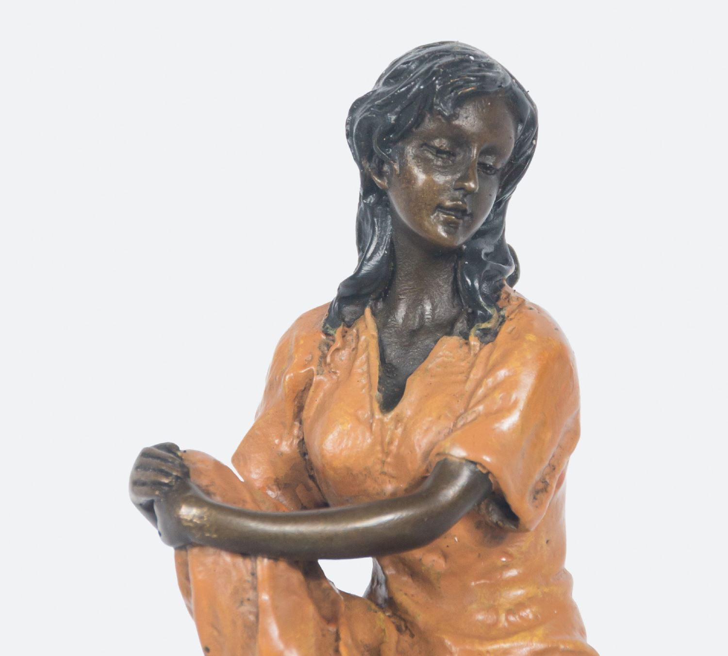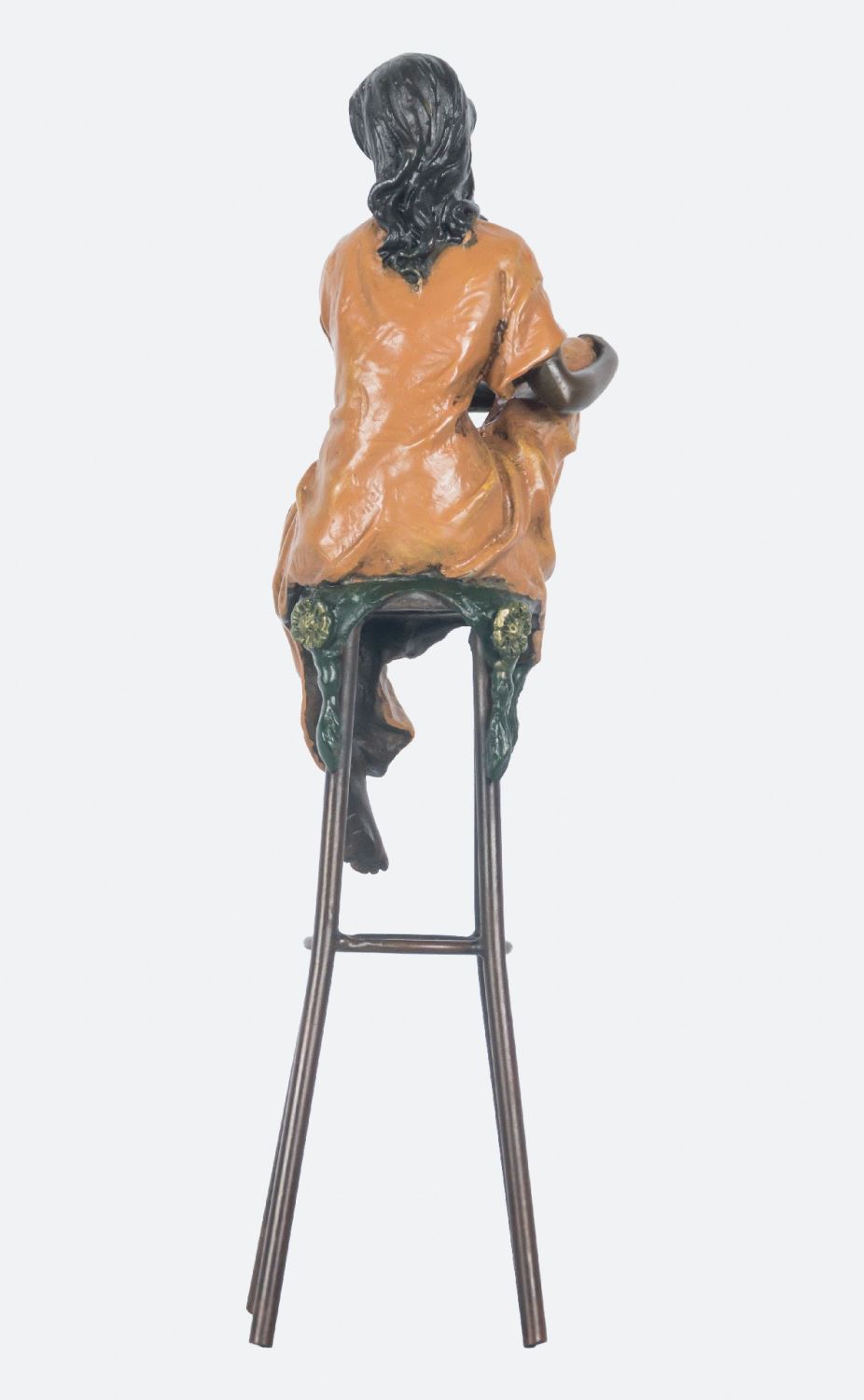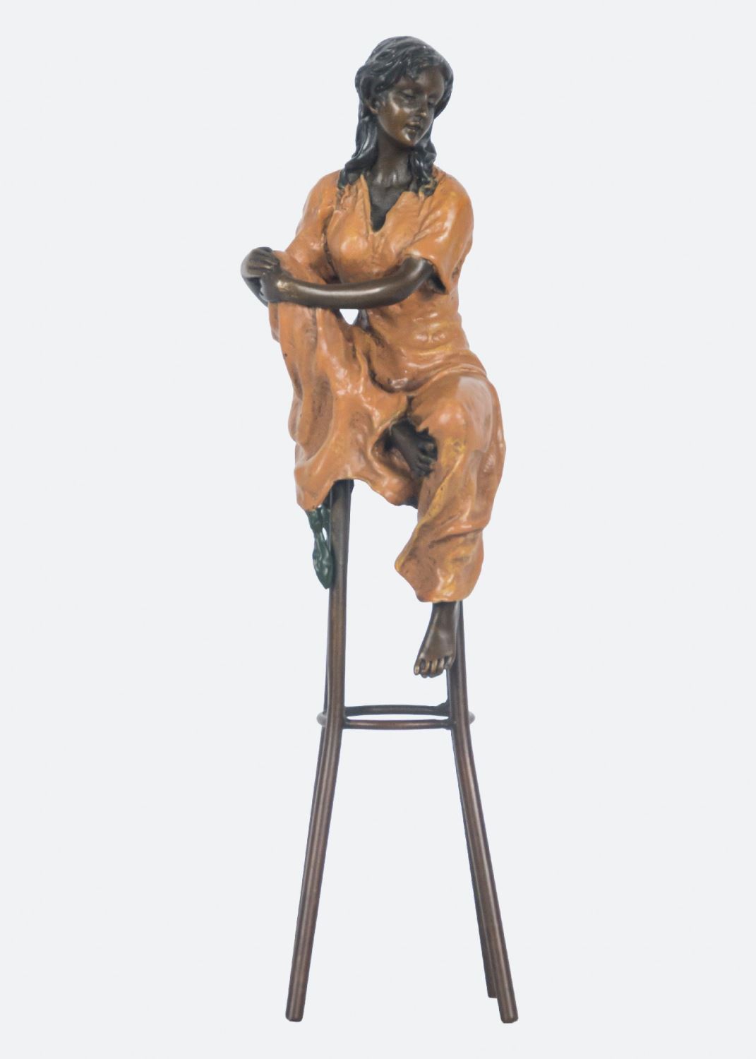 Sentada en un taburete. Figura en bronce parcialmente policromado. Firmado. Medidas: 28 x 8 x 8 cm.