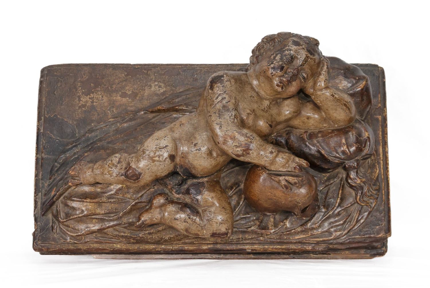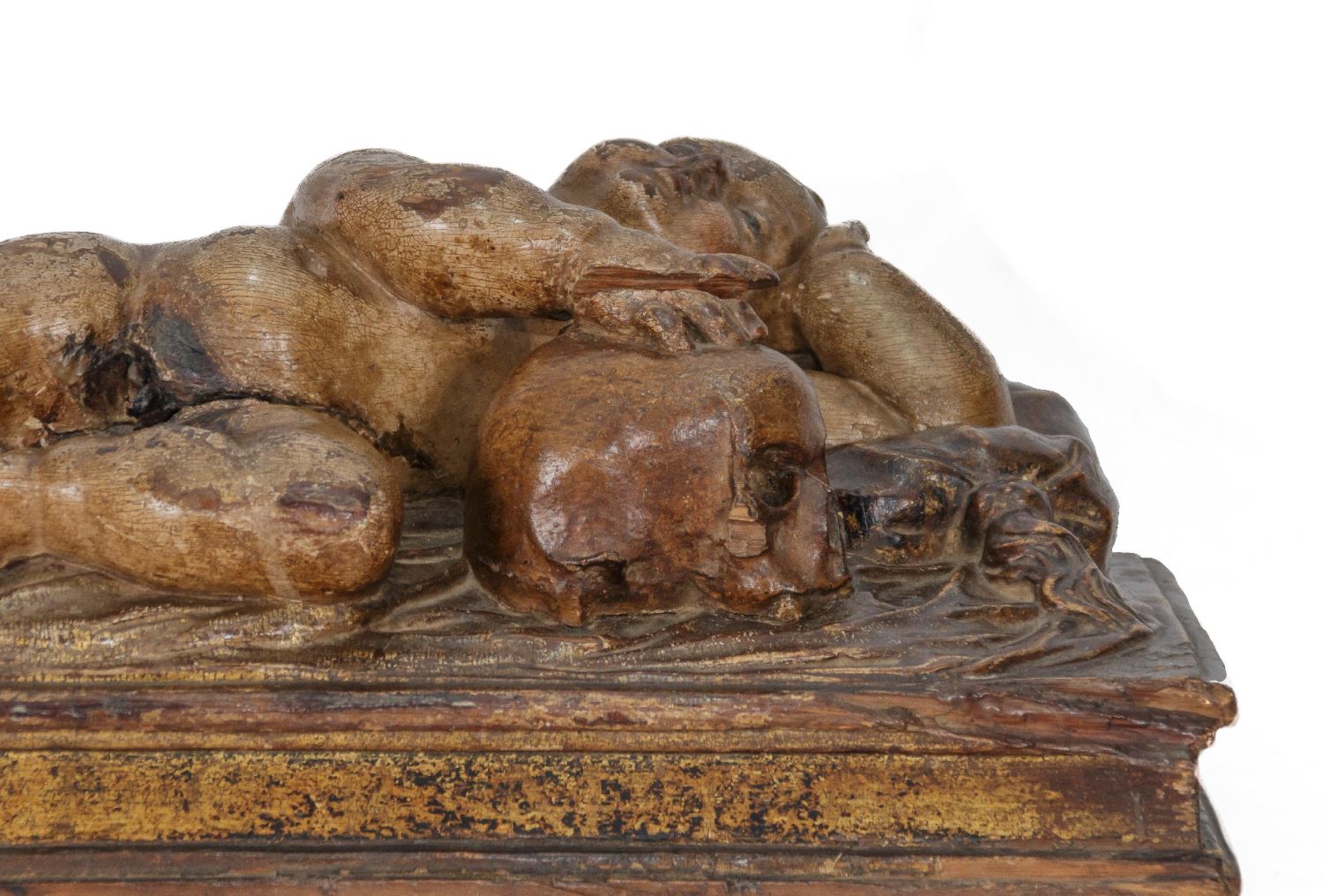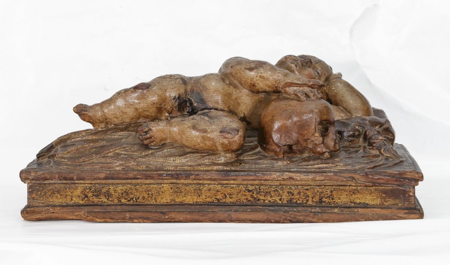 Niño Jesús dormido. Realizado en madera tallada, policromada y dorada. Medidas: 22 x 30 x 58 cm.
