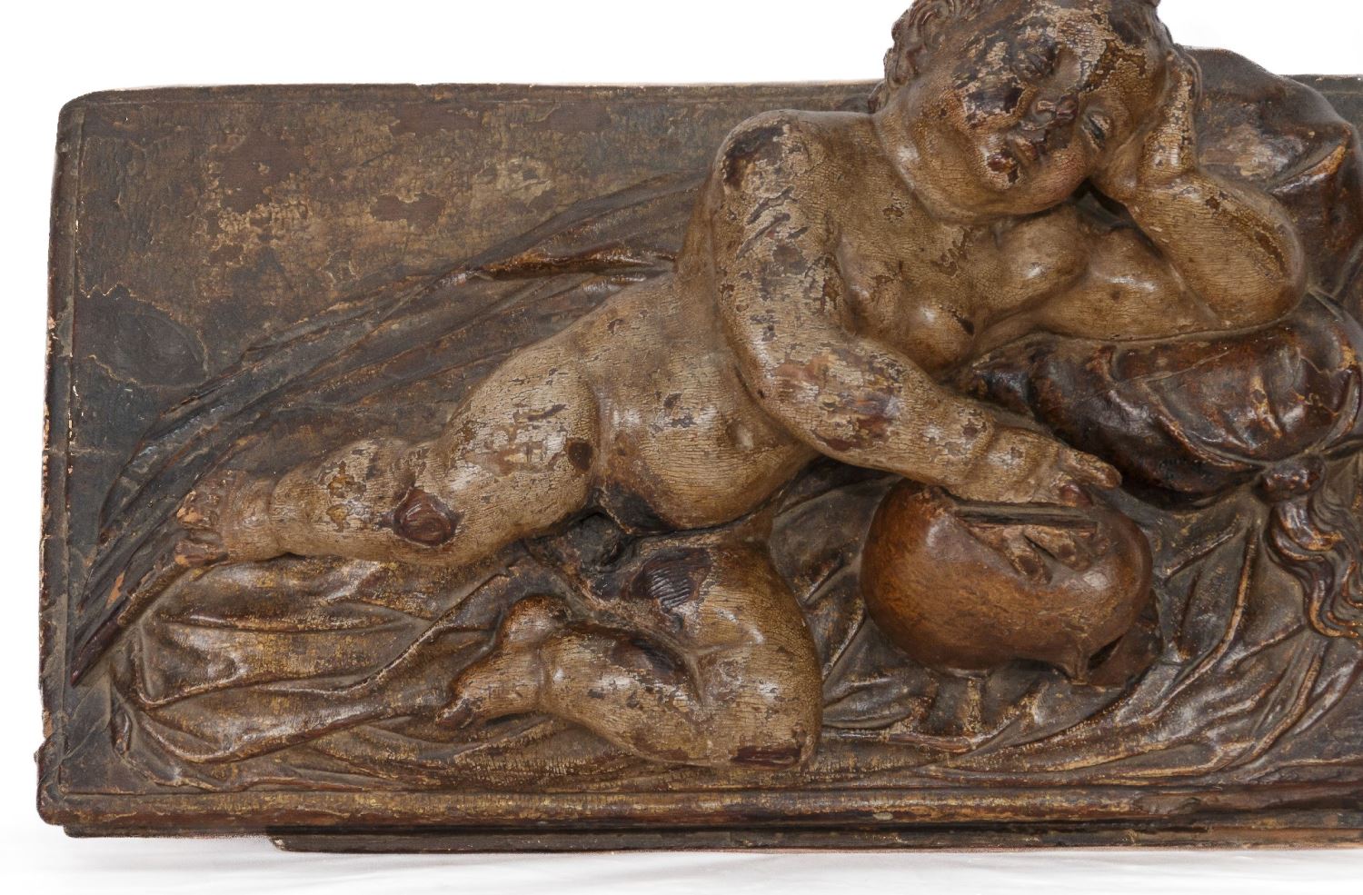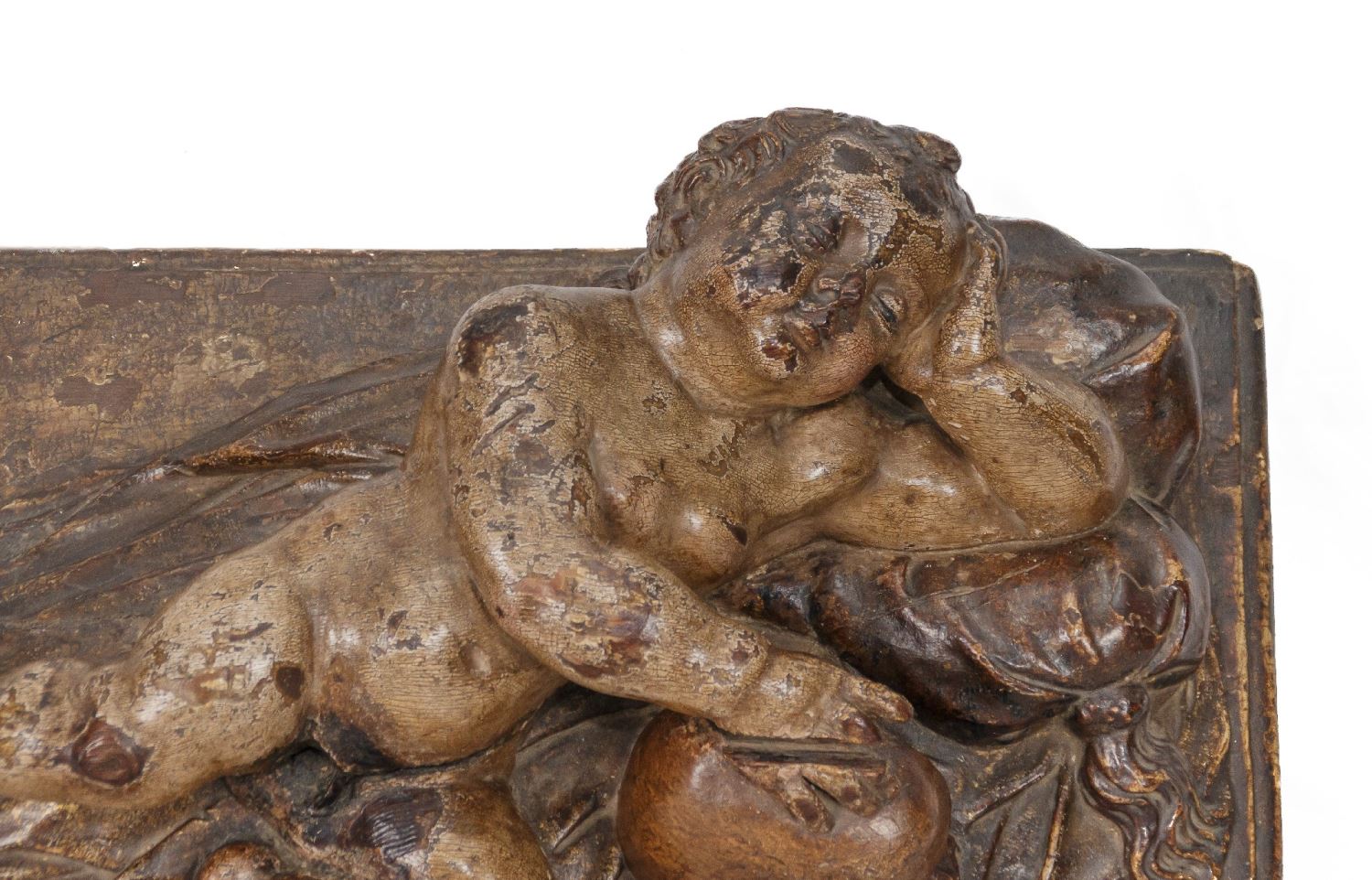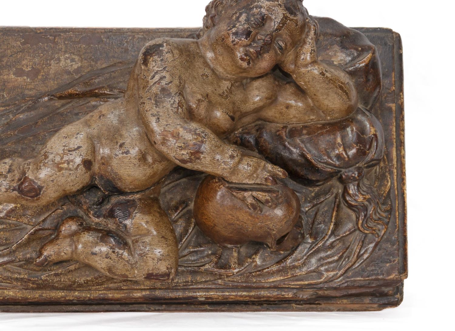 Niño Jesús dormido. Realizado en madera tallada, policromada y dorada. Medidas: 22 x 30 x 58 cm.