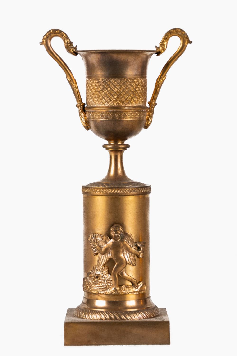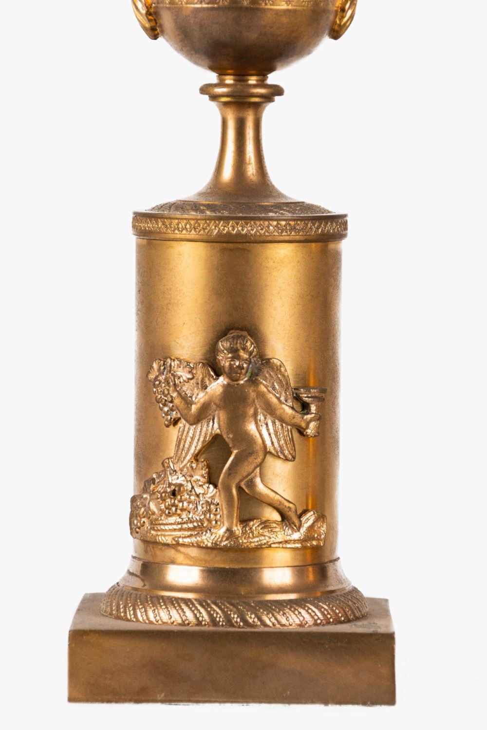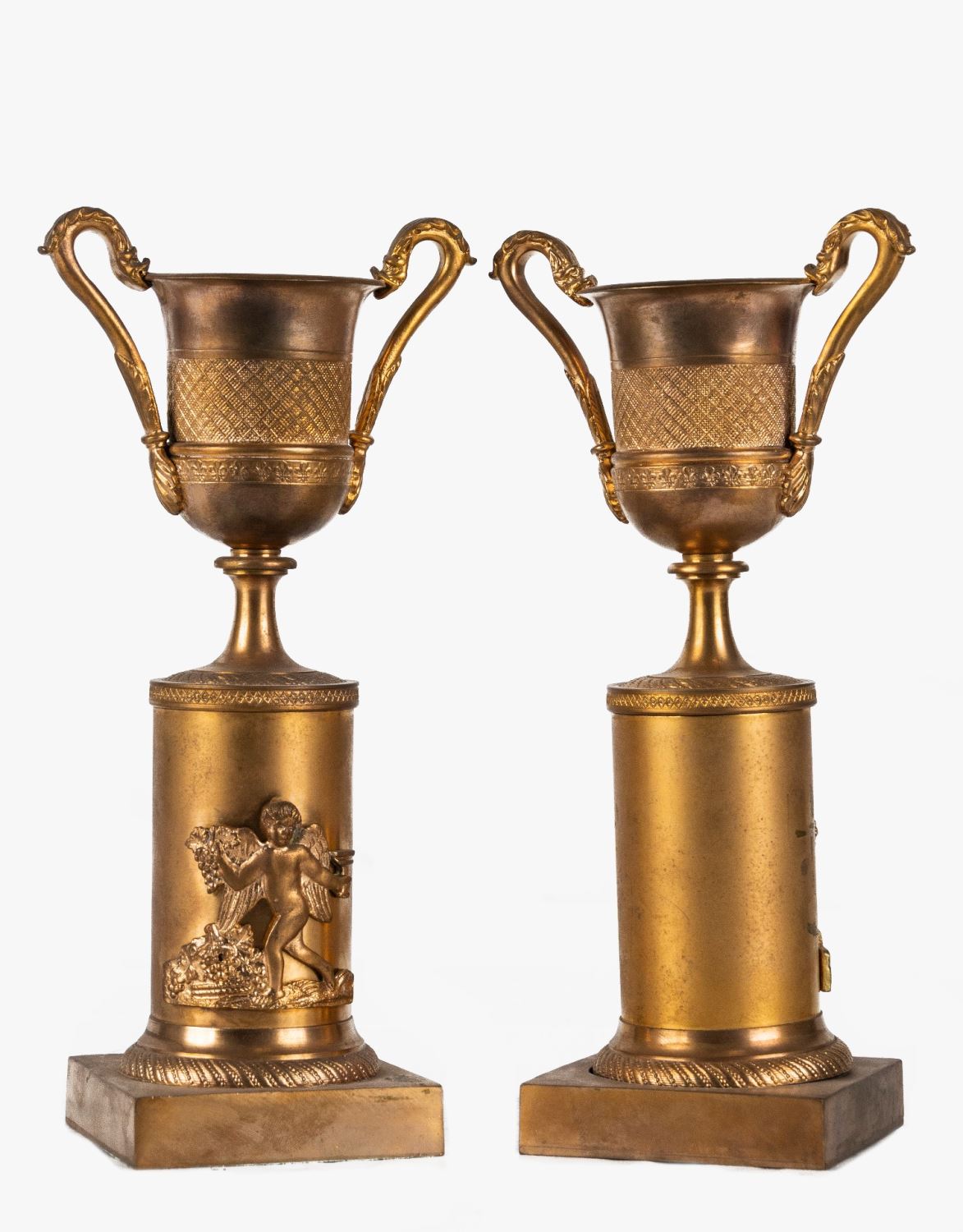 Realizadas en bronce dorado. Presentan relieve de amorcillo báquico. Medidas: 25 x 10 x 16 cm.