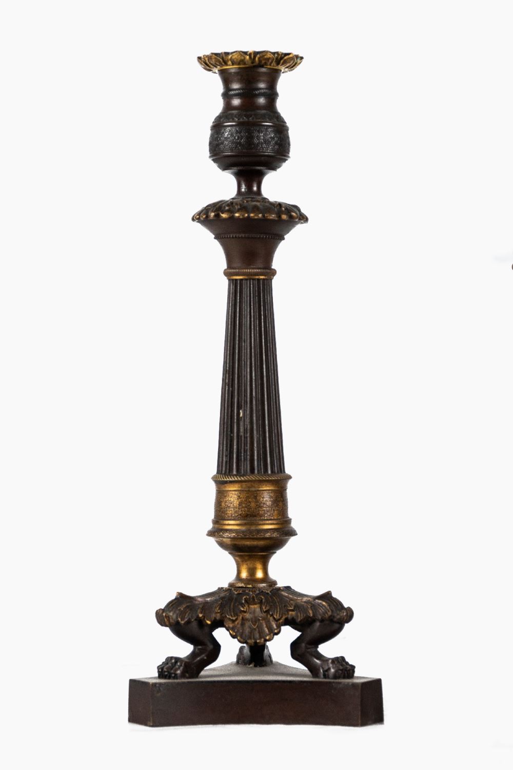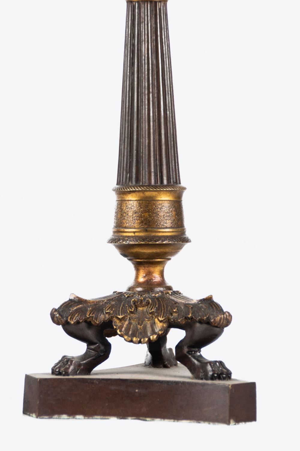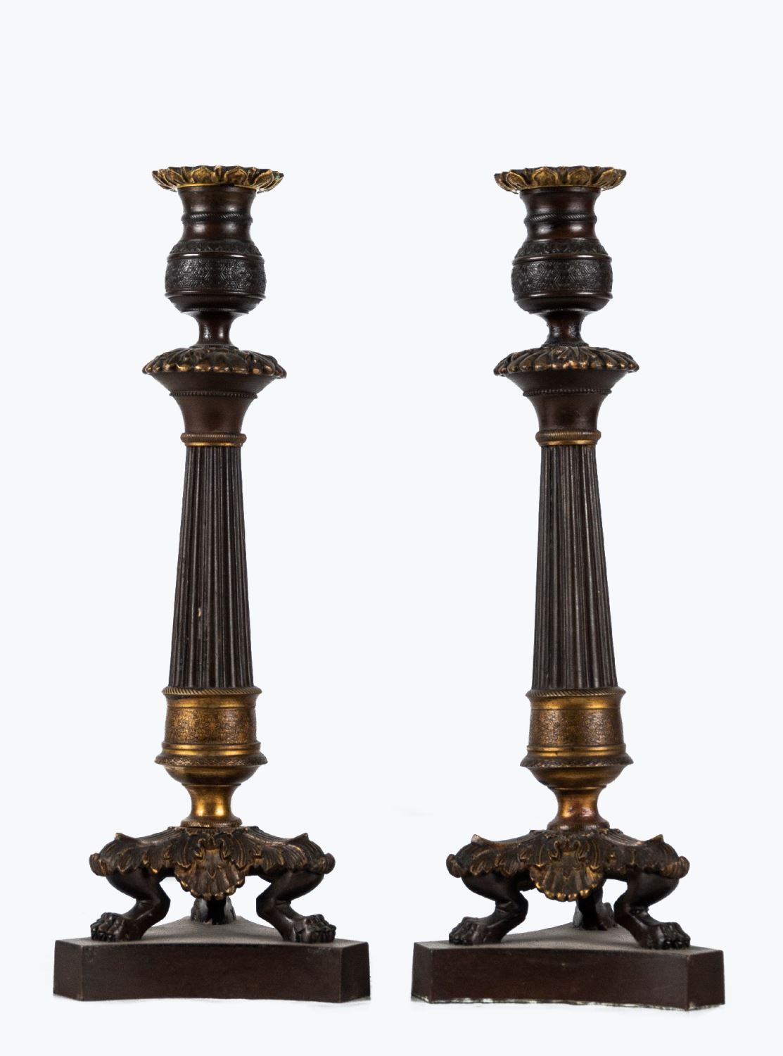 Realizados en bronce dorado y pavonado. Apoyan sobre patas de garra. Altura: 31 cm.
